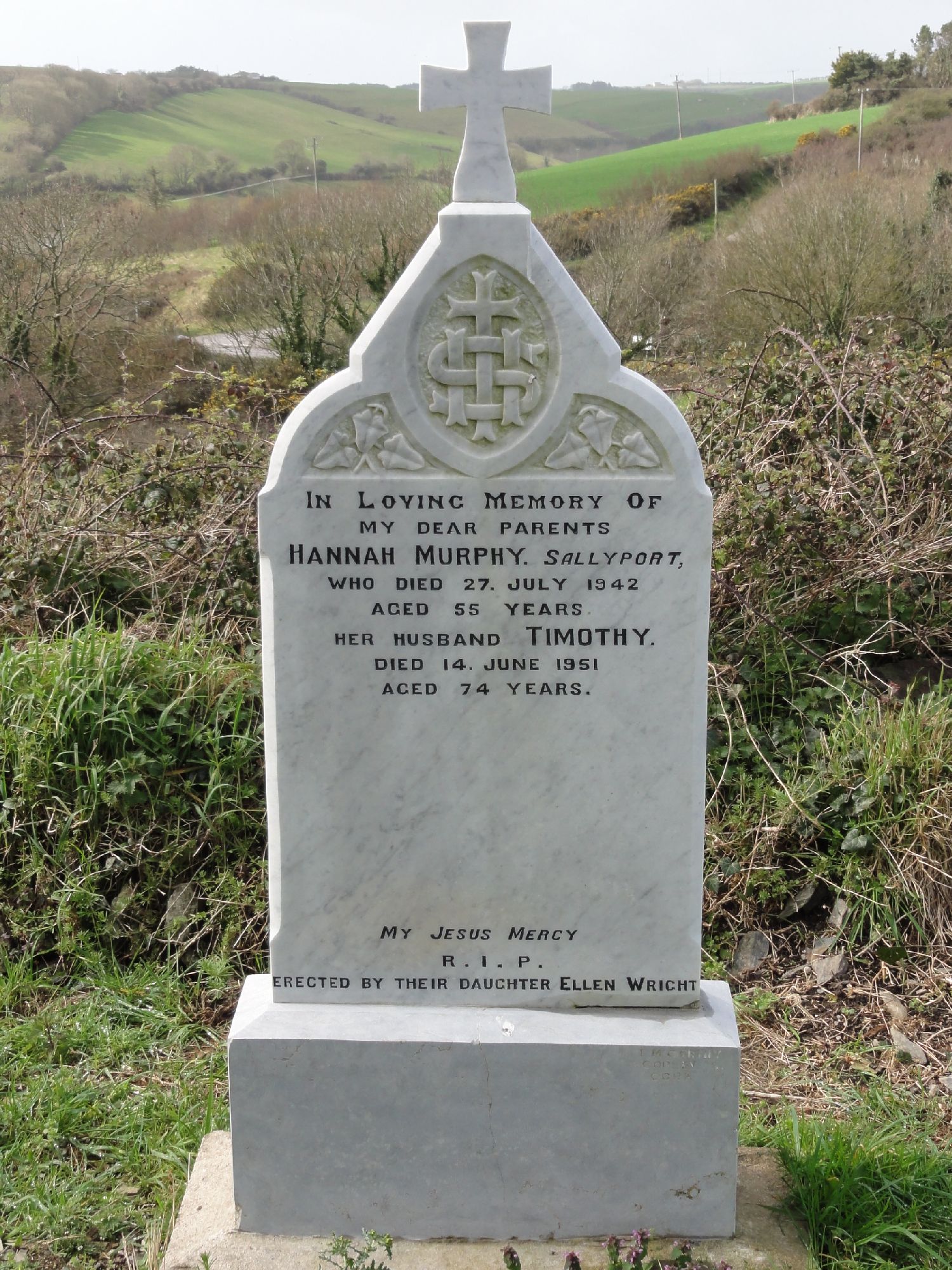In loving memory of My dear parents Hannah Murphy Sallyport Who died 27 July 1942 Aged 55 years Her husband Timothy Died 14 June 1951 Aged 74 years My Jesus mercy RIP Erected by their daughter Ellen Wright