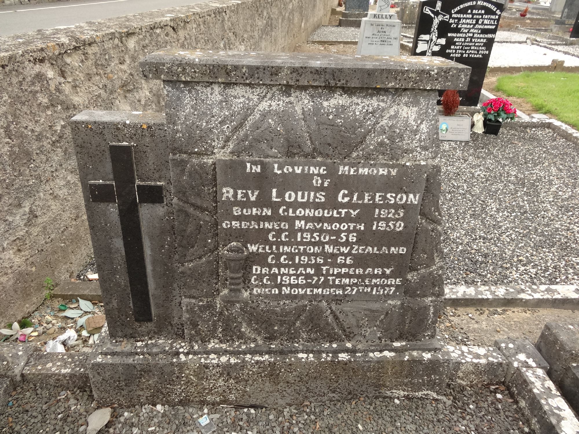 A lasting memorial to Father Gleeson was his work on  the preservation of the ruins of the old church and moated graveyard in the town park. He with his dedicated crew of workers and advisors resurrected this iconic Teampall Mor from a tangled mass of briars and stones to some semblance of its former glory.