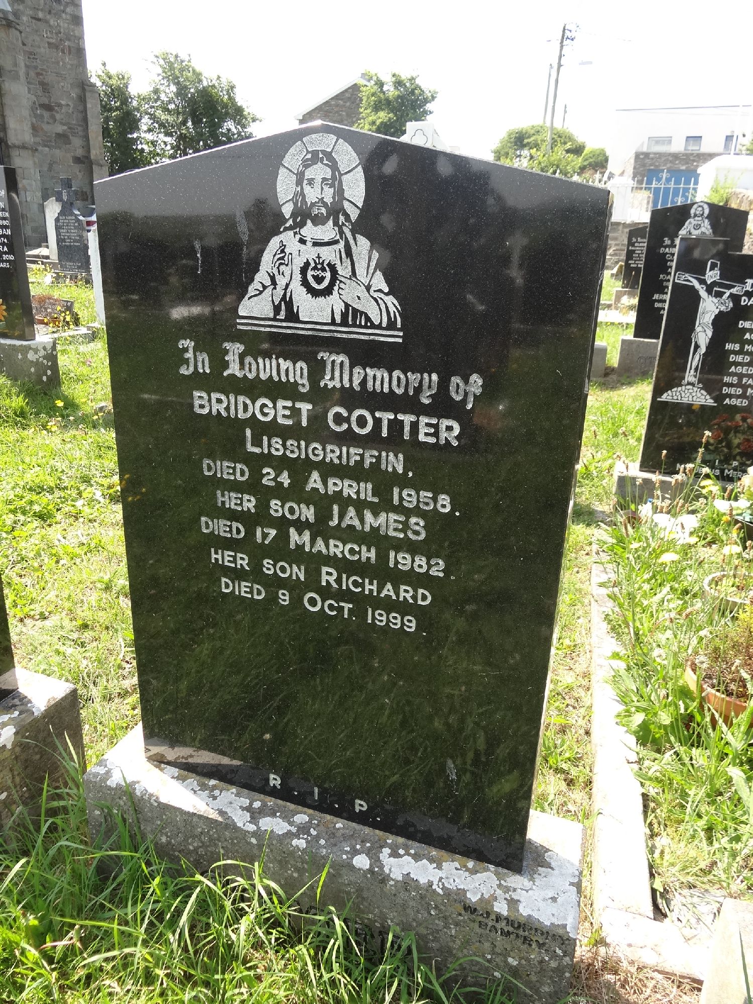 In Loving Memory ofBridget CotterLissigriffinDied 24 April 1958Her son JamesDied 17 March 1982Her son RichardDied 9 Oct 1999