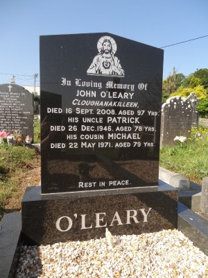 In loving memory of John O'LearyCloughanekilleendied 16 Sept 2008, aged 97 yearshis uncle Patrickdied 26 Dec 1946, aged 78 yearshis cousin Michael died 22 May 1971, aged 79 years
