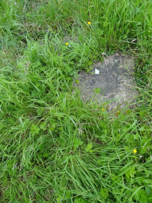 Grave plot marked by flag stone with grass grown over.