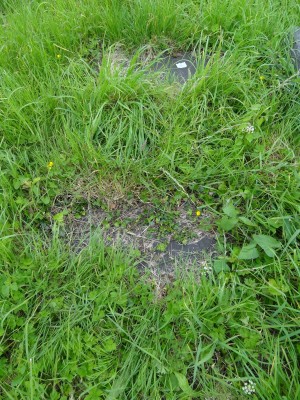 Grave plot marked by flag stone grassed over.