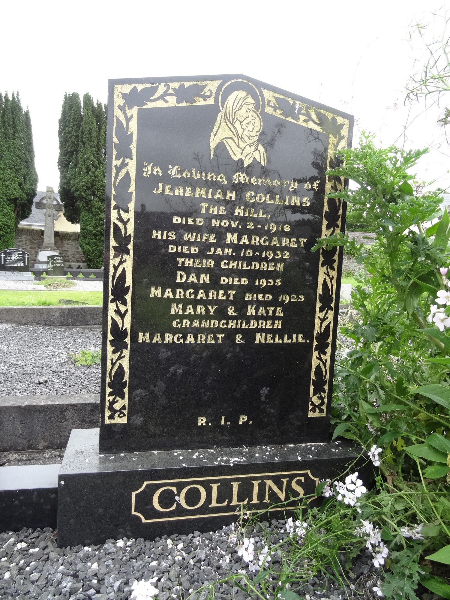 In Loving Memory ofJEREMIAH COLLINSThe HillDied Nov. 2 - 1918His Wife MARGARETDied Jan. 10 - 1932Their ChildrenDAN Died 1935MARGARET Died 1923MARY & KATEGrandchildrenMARGARET & NELLIE