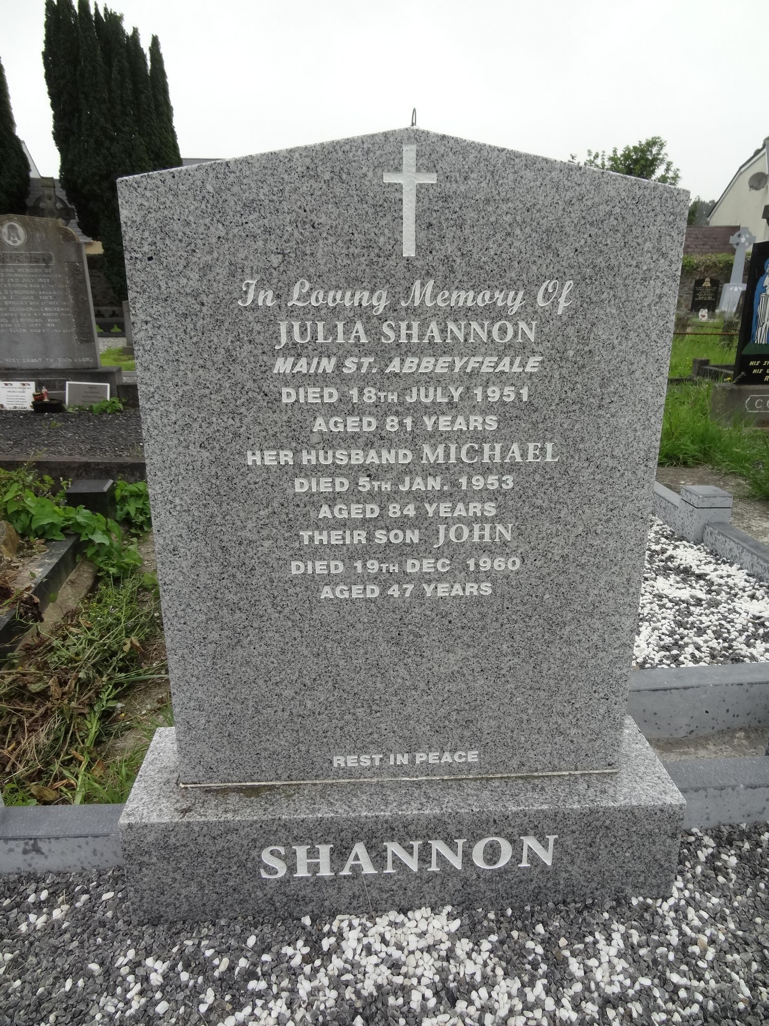 In Loving Memory OfJULIA SHANNONMain St. AbbeyfealeDied 18TH July 1951Aged 81 YearsHer Husband MICHAELDied 5TH Jan. 1953Aged 84 YearsTheir Son JOHNDied 19TH Dec 1960Aged 47 Years