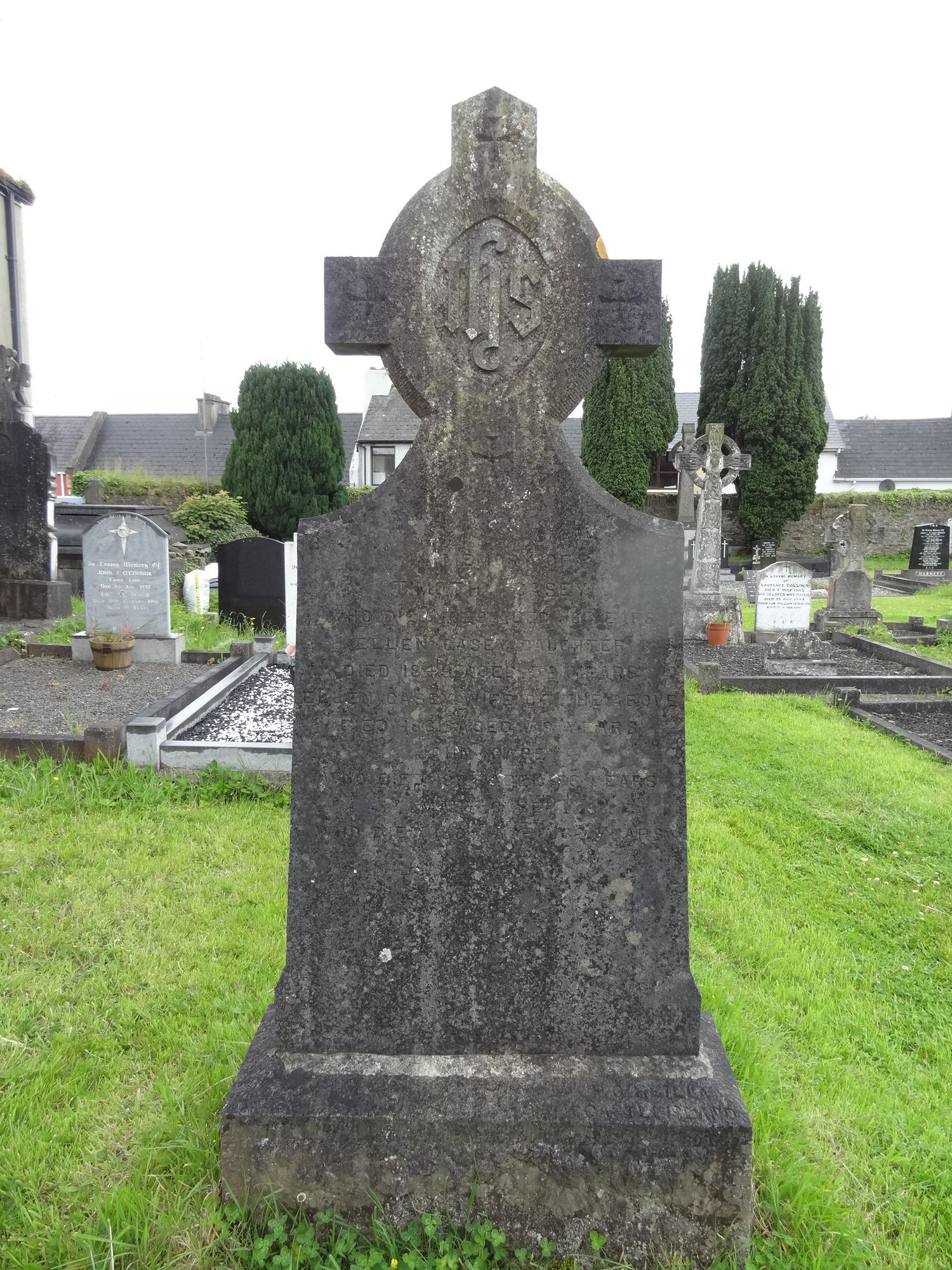 IN MEMORY OFTIMOTHY CASEYWHO DIED 1829 AGED 56 YEARSELLEN CASEY DAUGHTERSDIED 1849 AGED 32 YEARSELLEN CASEY WIFE OF THE ABOVEDIED 1861 AGED 78 YEARSJOHN CASEYWHO DIED 1887 AGED 76 YEARSMARY CASEYWHO DIED 1885 AGED 62 YEARSÂ