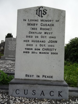 In Loving Memory ofMARY CUSACK( NEE ROCHE )Cratloe WestDied 26 Oct. 1940Her Husband JOHNDied 5 Oct. 1985Their Son CHRISTYDied 20TH March 2005