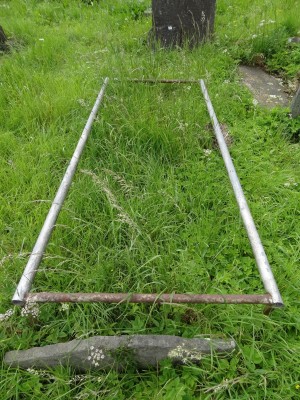 No headstone. Single grave plot marked by iron pipe surround.