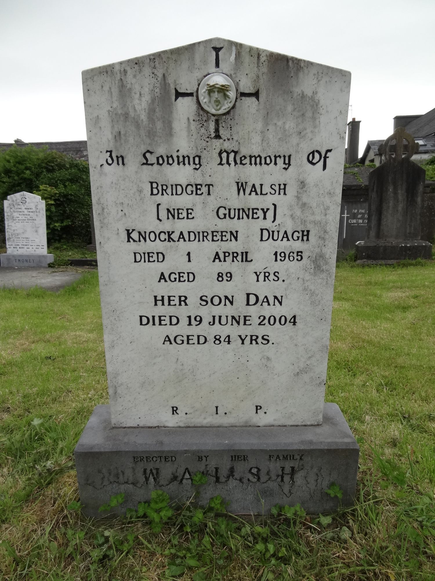In Loving Memory OfBRIDGET WALSH[ NEE GUINEY ]Knockadireen DuaghDied 1 April 1965Aged 89 Yrs.Her Son DANDied 19 JUNE 2004Aged 84 Yrs.