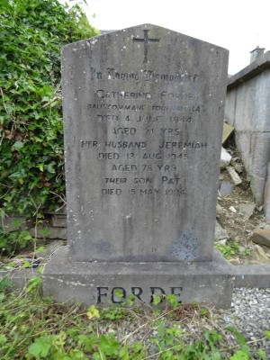 In Loving Memory ofCATHERINE FORDEBallycommane TournafullaDied 4 June 1944Aged 71 YrsHer Husband JeremiahDied 13 Aug 1945Aged 78 YrsTheir Son PatDied 15 May 1994
