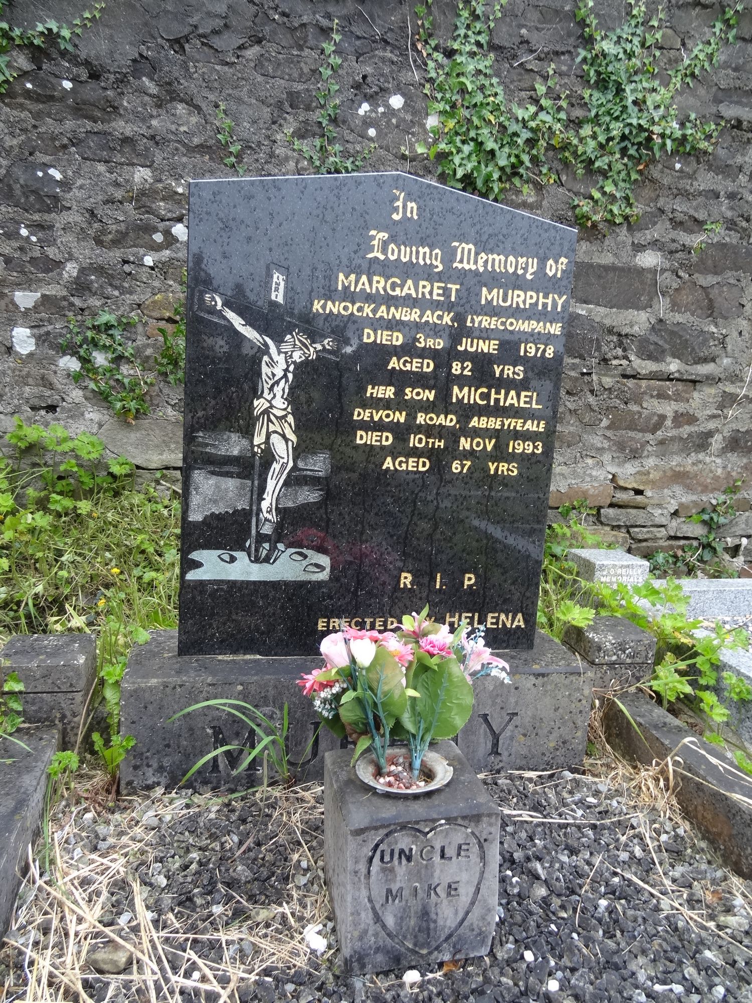 InLoving Memory ofMARGARET MURPHYKnockanbrack, Lyrecompane Died 3RD June 1978Aged 82 YrsHer Son MICHAELDevon Road, AbbeyfealeDied 10TH Nov 1993Aged 67 Yrs