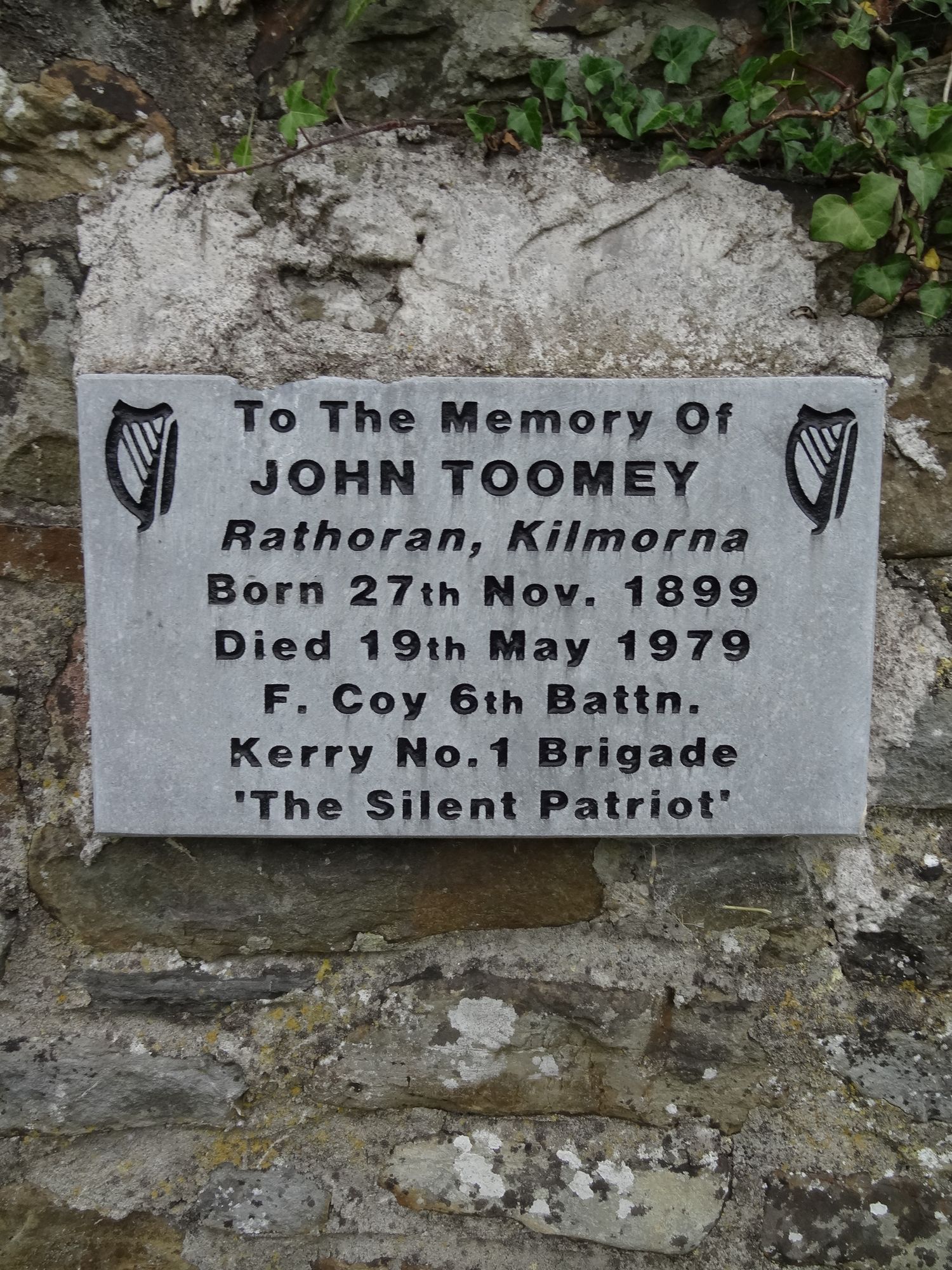 To The Memory OfJOHN TOOMEYRathoran, KilmornaBorn 27th Nov. 1899Died 19th May 1979F. Coy 6th Battn.Kerry No. 1 Bridage'The Silent Patriot'