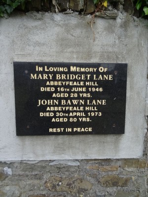 In Loving Memory OfMARY BRIDGET LANEAbbeyfeale HillDied 16TH June 1946Aged 28 Yrs.JOHN BAWN LANEAbbeyfeale HillDied 30TH April 1973Aged 80 Yrs.