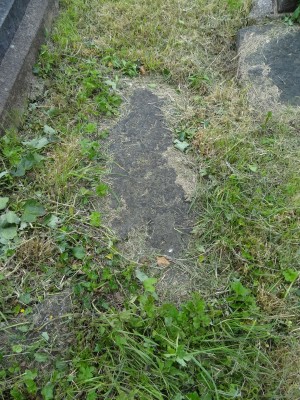 Flag stone covering grave plot, partially grassed over.
