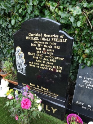 CHERISHED MEMORIES OF/ MICHAEL (MICK) FEEHILY/ CLOGHERMORE CALRY/ DIED 29th MARCH 1992/ AGED 75 YEARS/ AND HIS WIFE/ MARY (MAI) NEE O'CONNOR/ DIED 1st JAN. 2015/ AGED 93 YEARS./ AND THEIR GRANDSON OISIN/ (BORN AN ANGEL) FEB. 1999/ REST IN PEACE/ Death leaves a heartache no one can heal/ Love leaves a memory no one can steal