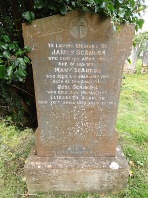 IN LOVING MEMORY OF/ JAMES SCANLON/ WHO DIED 11th APRIL 1922/ AND OF HIS WIFE/ MARY SCANLON/ WHO DIED 8th JANUARY 1951/ ALSO OF HIS DAUGHTER/ ROSE SCANLON/ WHO DIED 25th MARCH 1898/ ELIZABETH SCANLON/ DIED 20th APRIL 1984 AGED 87 YEARS/ R.I.P./ ERECTED BY HIS/ DAUGHTER KATHLEEN