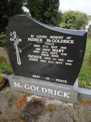 IN LOVING MEMORY OF/ PATRICK McGOLDRICK/ TULLY/ DIED 17th MAY 1935/ HIS WIFE MARY/ DIED 20th SEPT. 1949/ THEIR SONS/ PATRICK DIED 1st DEC 1987/ JOHN DIED 16th SEPT 1999/ RES IN PEACE