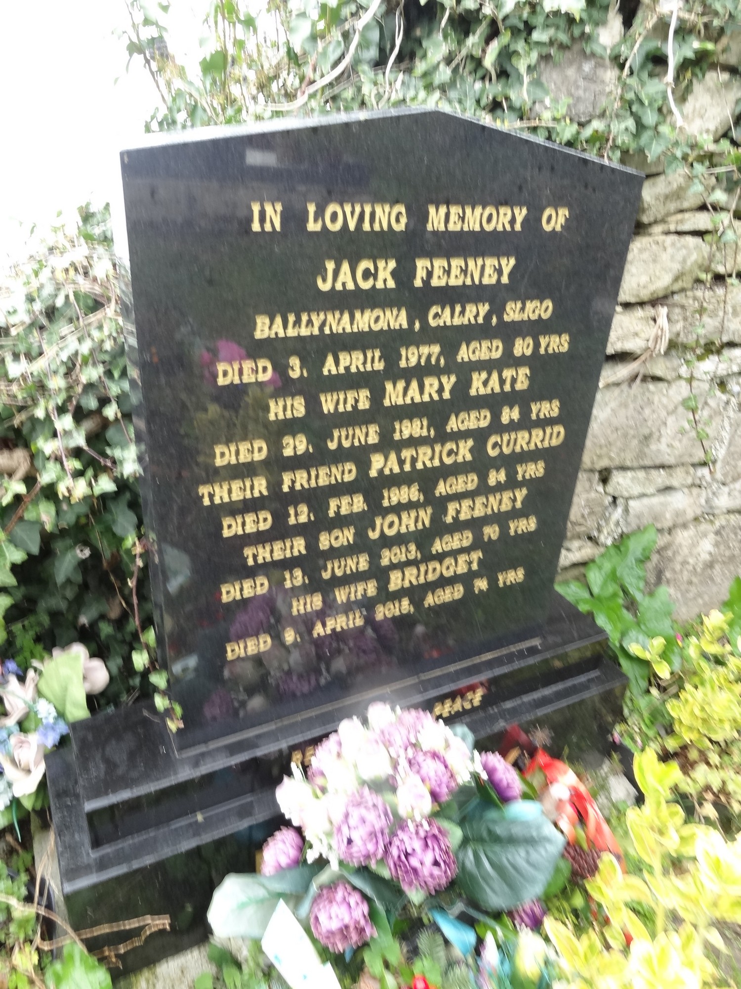 IN LOVING MEMORY OF/ JACK FEENEY/ BALLYNAMONA, CALRY, SLIGO/ DIED 3 APRIL 1977, AGED 80 YRS/ HIS WIFE MARY KATE/ DIED 29 JUNE 1981 AGED 84 YRS/ THEIR FRIEND PATRICK CURRID/ DIED 12 FEB 1986, AGED 84 YRS/ THEIR SON JOHN FEENEY/ DIED 13 JUNE 2013, AGED 70 YRS/ HIS WIFE BRIDGET/ DIED 9 APRIL 2015 AGED 74 YRS/ REST IN PEACE/ FEENEY