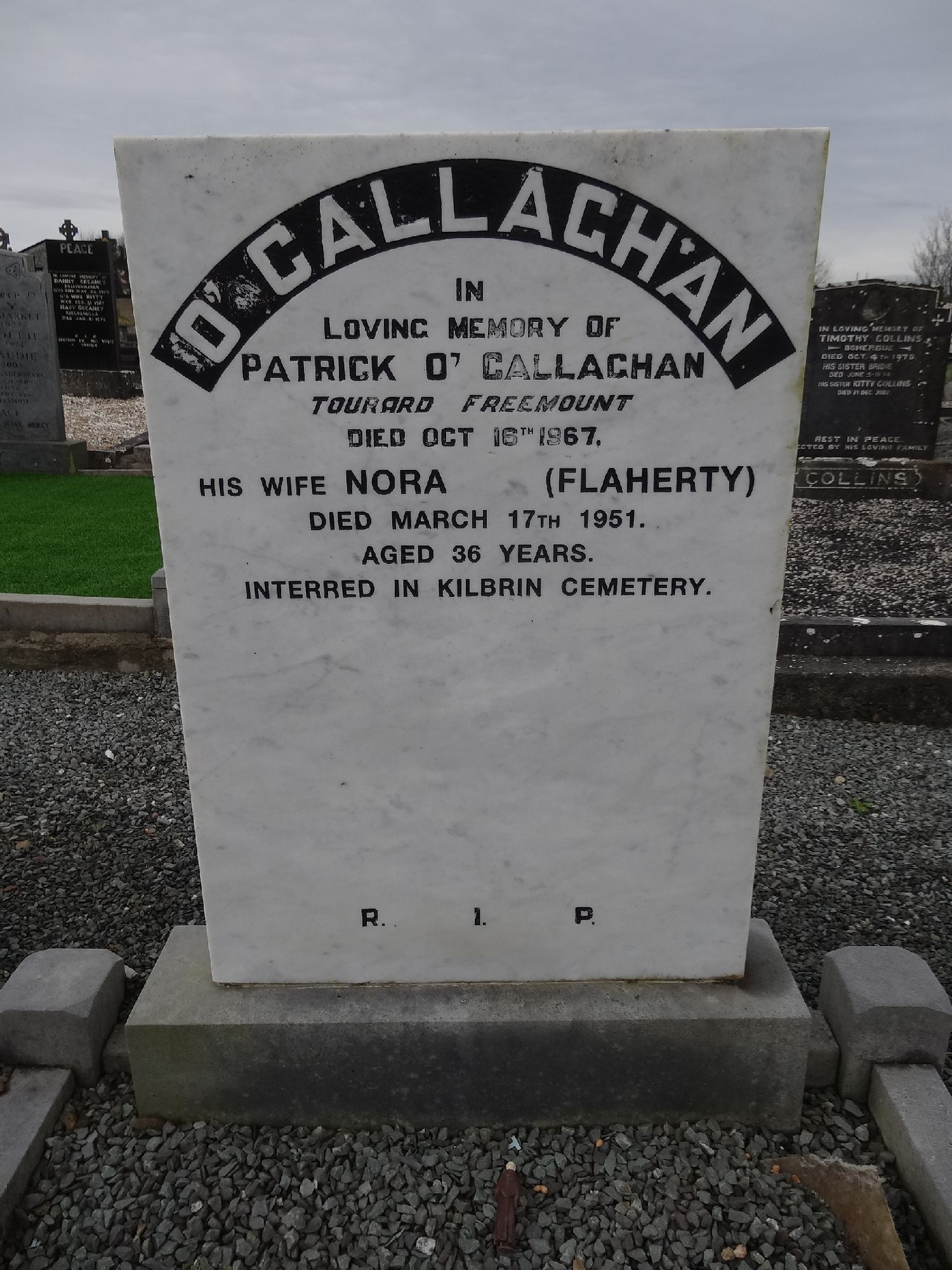 HIS WIFE NORA (FLAHERTY)DIED MARCH 17 TH 1951.AGED 36 YEARS.INTERRED IN KILBRIN CEMETERY.