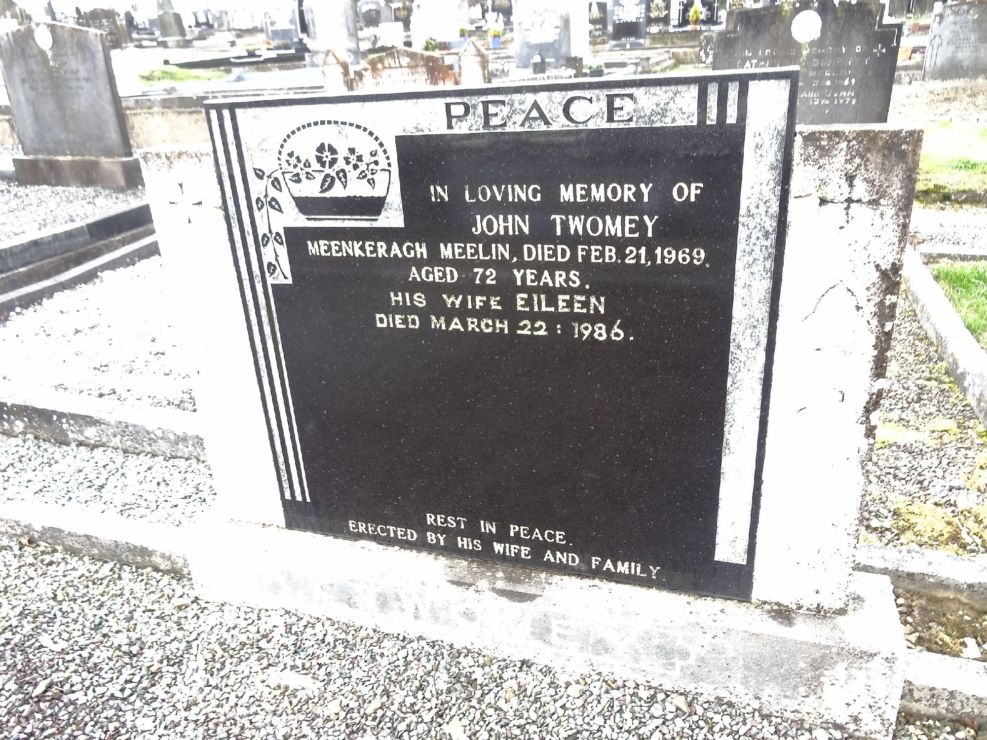IN LOVING MEMORY OFJOHN TWOMEYMEENKERAGH MEELIN, DIED FEB. 21, 1969.AGED 72 YEARS.HIS WIFE EILEENDIED MARCH 22: 1986.