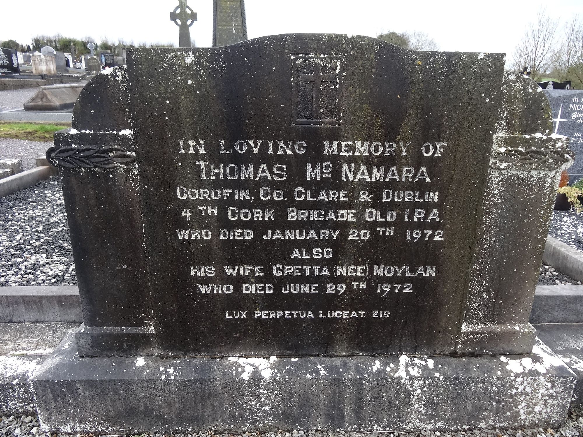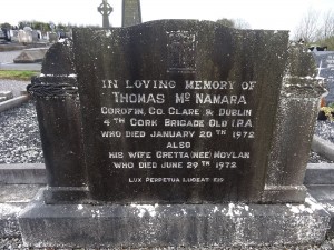 IN LOVING MEMORY OF THOMAS MCNAMARACOROFIN, CO. CLARE & DUBLIN4 TH CORK BRIGADE OLD IRA.WHO DIED JANUARY 20 TH 1972ALSOHIS WIFE GRETTA (NEE) MOYLANWHO DIED JUNE 29 TH 1972