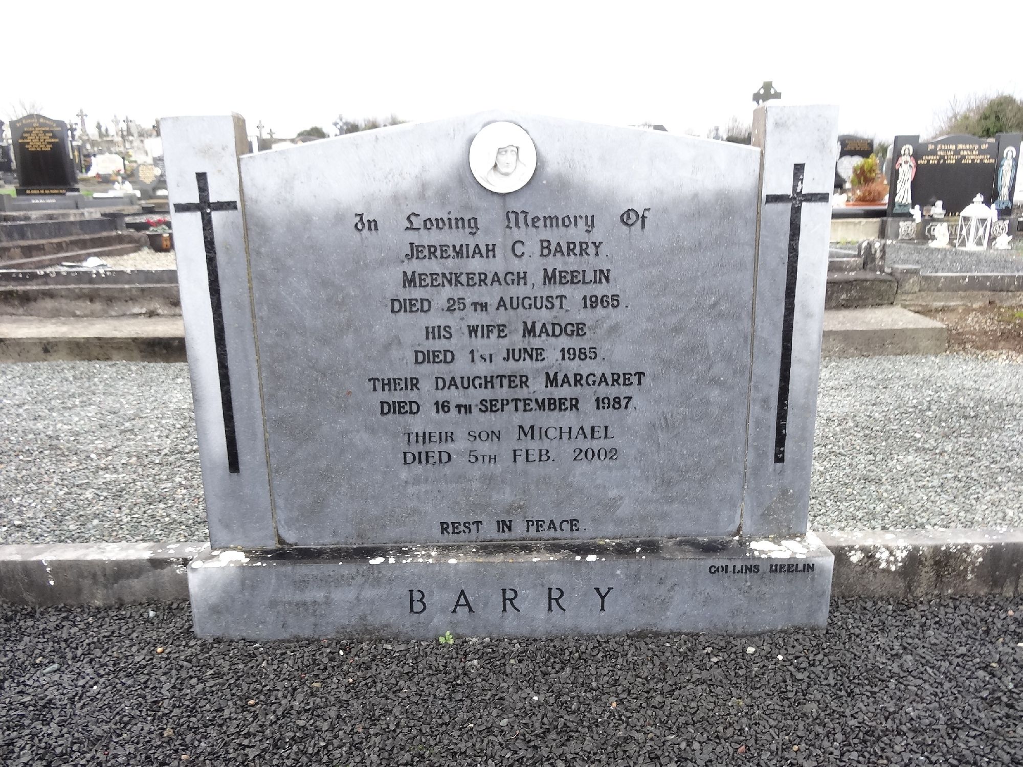 In Loving Memory OfJEREMIAH C. BARRYMEENKERAGH, MEELINDIED 25 TH AUGUST 1965.HIS WIFE MADGEDIED 1 ST JUNE 1985.THEIR DAUGHTER MARGARETDIED 16 TH SEPTEMBER 1987.THEIR SON MICHAEL DIED 5 TH FEB. 2002