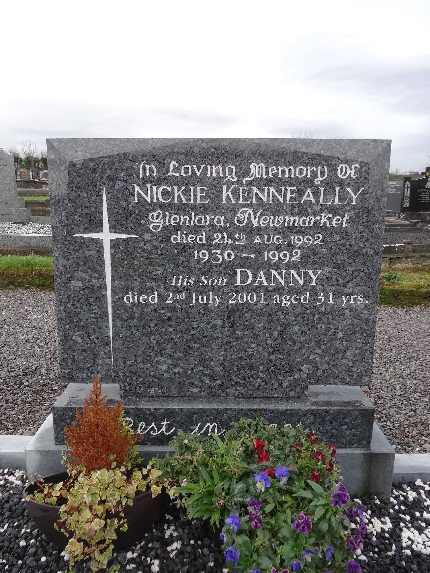 In Loving Memory OfNICKIE KENNEALLYGlenlara, Newmarketdied 24 th AUG. 19921930 - 1992His Son DANNYdied 2 nd July 2001 aged 31 yrs.