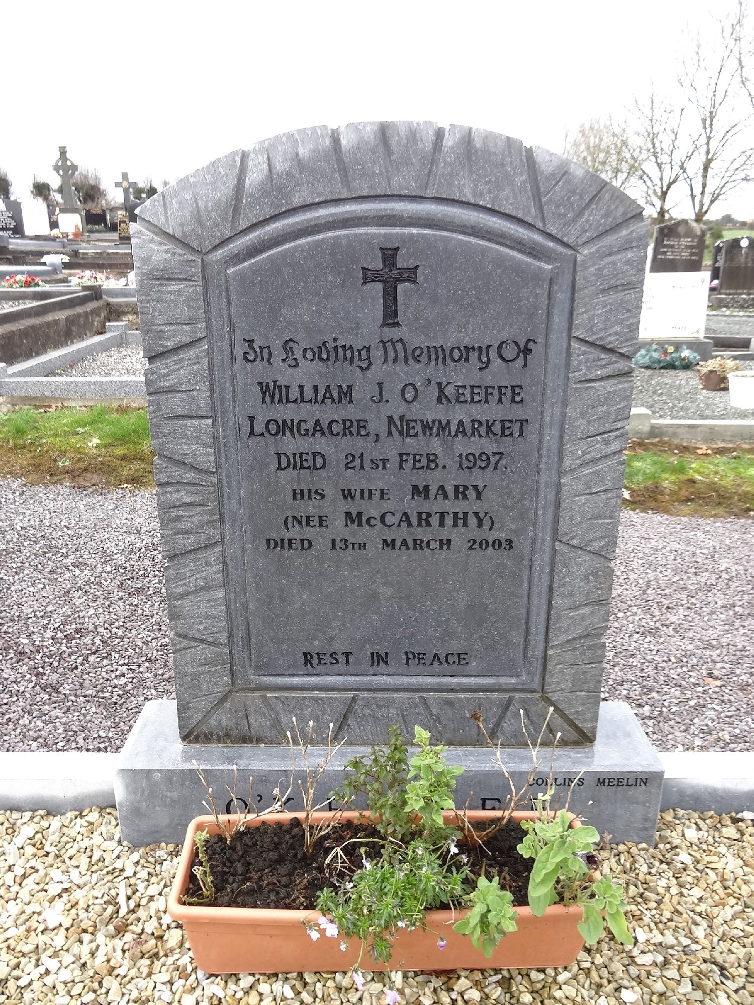 In Loving Memory OfWILLIAM J. O'KEEFFELONGACRE, NEWMARKETDIED 21 ST FEB. 1997.HIS WIFE MARY(NEE McCARTHY)DIED 13TH MARCH 2003