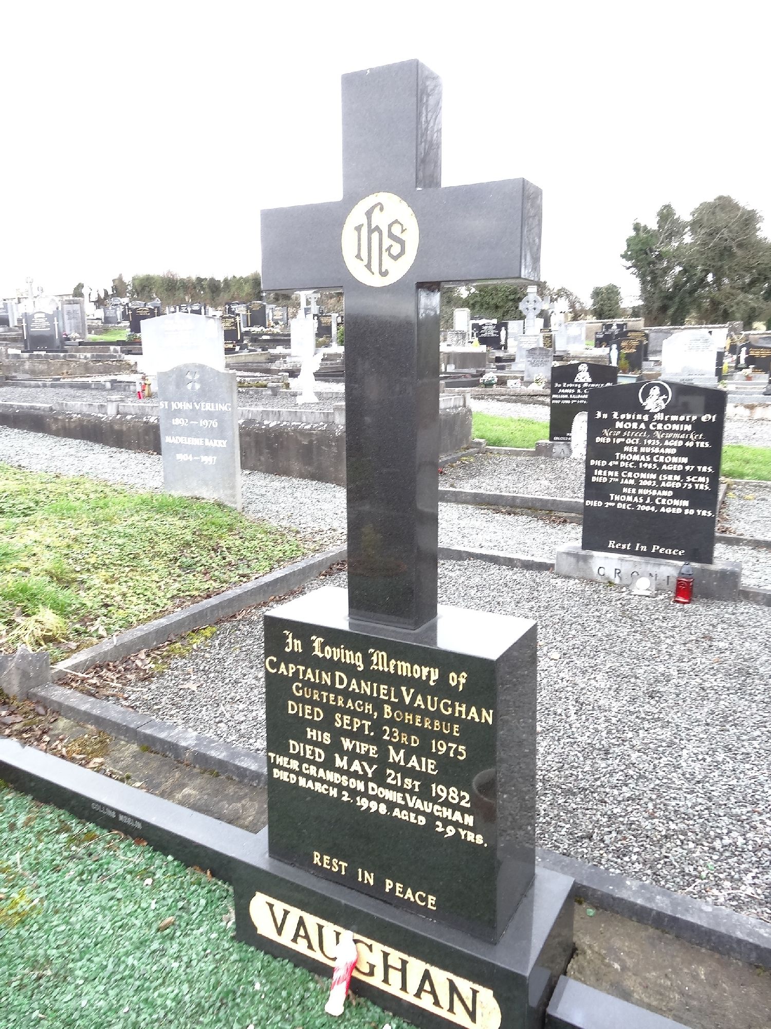 In Loving Memory Of CAPTAIN DANIEL VAUGHANGURTERAGH, BOHERBUEDIED SEPT. 23RD 1975HIS WIFE MAIEDIED MAY 21ST 1982THEIR GRANDSON DONIE VAUGHANDIED MARCH 2. 1998. AGED 29 YRS.