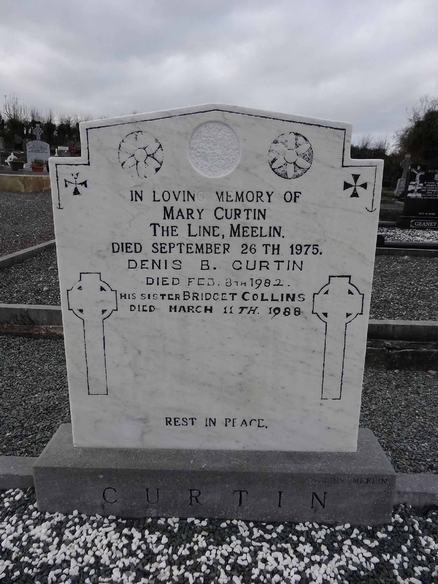 IN LOVING MEMORY OFMARY CURTINTHE LINE, MEELIN.DIED SEPTEMBER 26TH 1975.DENIS B. CURTINDIED FEB. 8TH 1982.HIS SISTER BRIDGET COLLINSDIED MARCH 11TH. 1988