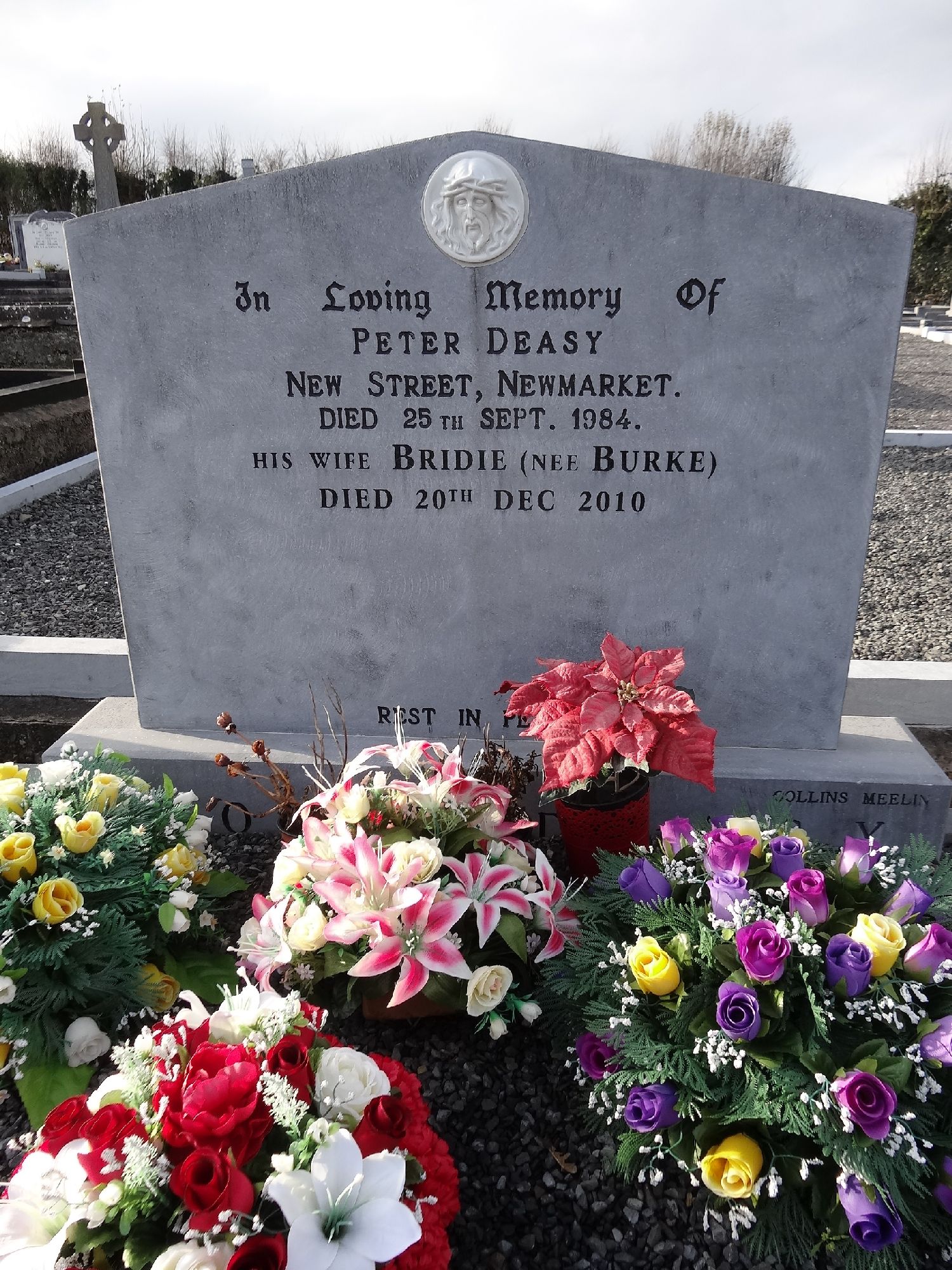 In Loving Memory OfPETER DEASYNEW STREET, NEWMARKET.DIED 25 TH SEPT. 1984.HIS WIFE BRIDIE (NEE BURKE)DIED 20 TH DEC 2010