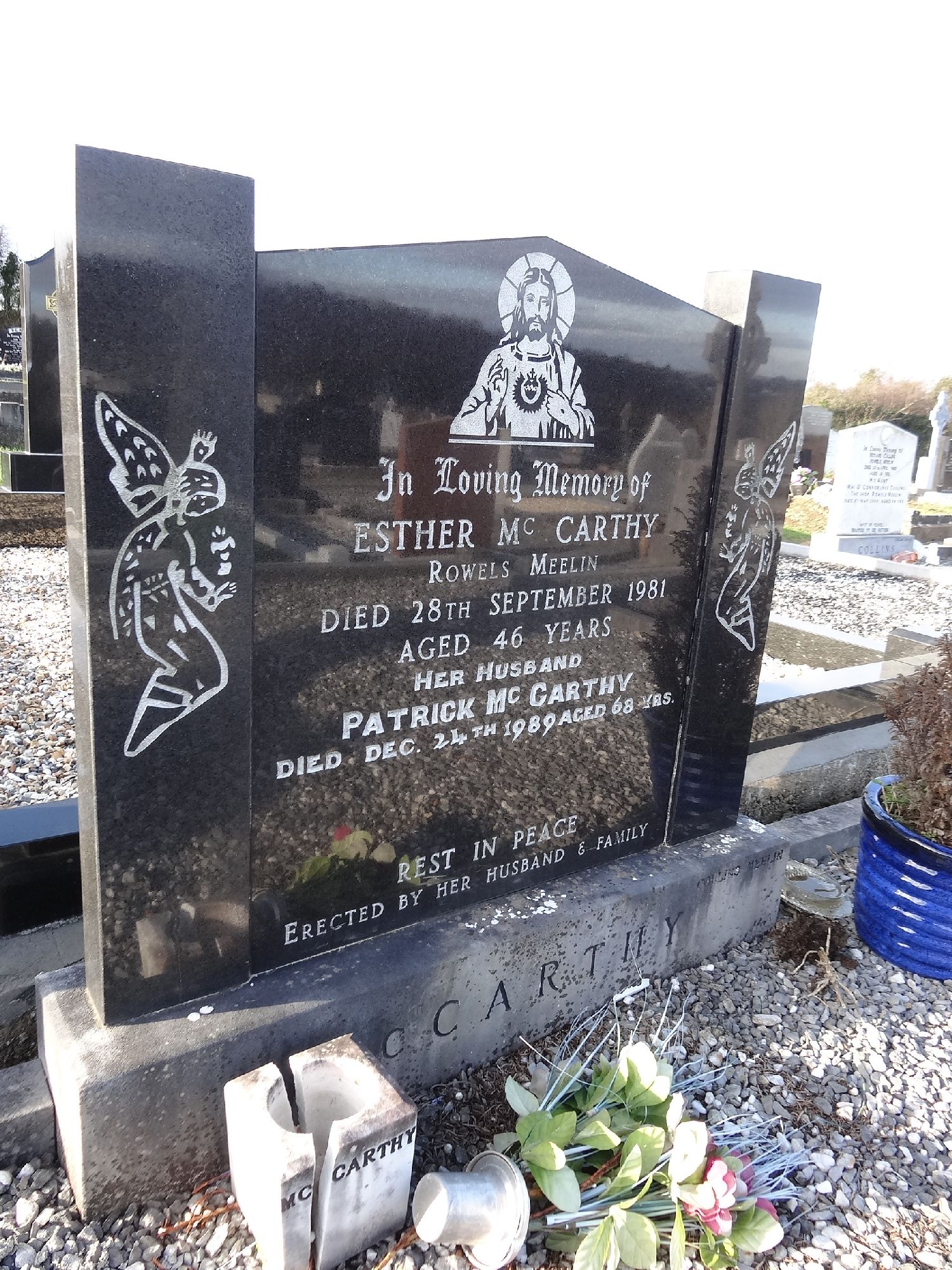 ESTHER MC CARTHYROWELS MEELINDIED 28 TH SEPTEMBER 1981AGED 46 YEARSHER HUSBANDPATRICK MC CARTHYDIED DEC. 24 TH 1989 AGED 68 YRS.