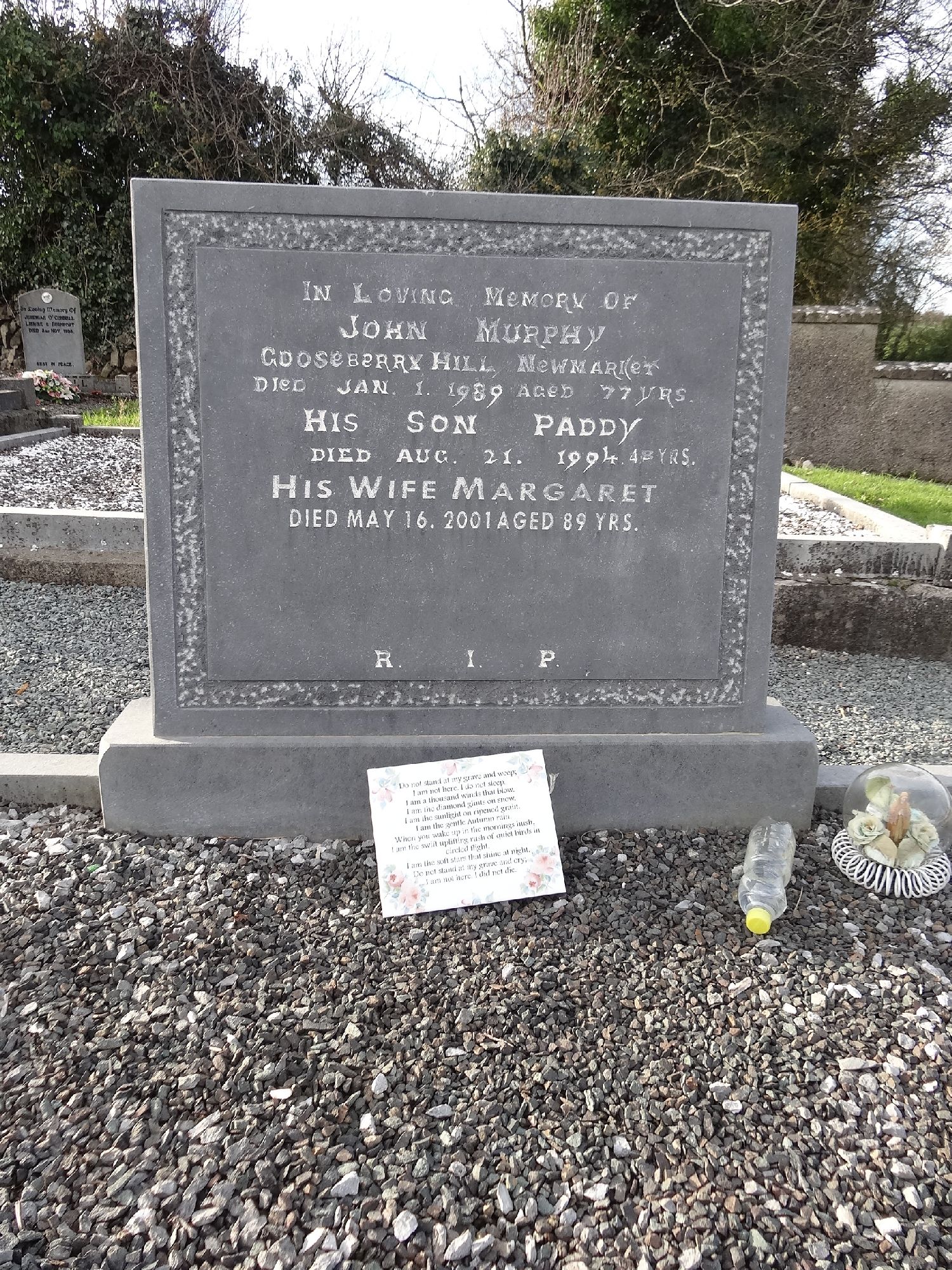 In Loving Memory OfJOHN MURPHYGOOSEBERRY HILL, NEWMARKETDIED JAN. 1. 1989 AGED 77 YRS.HIS SON PADDYDIED AUG. 21. 1994HIS WIFE MARGARETDIED MAY 16. 2001 AGED 89 YRS.