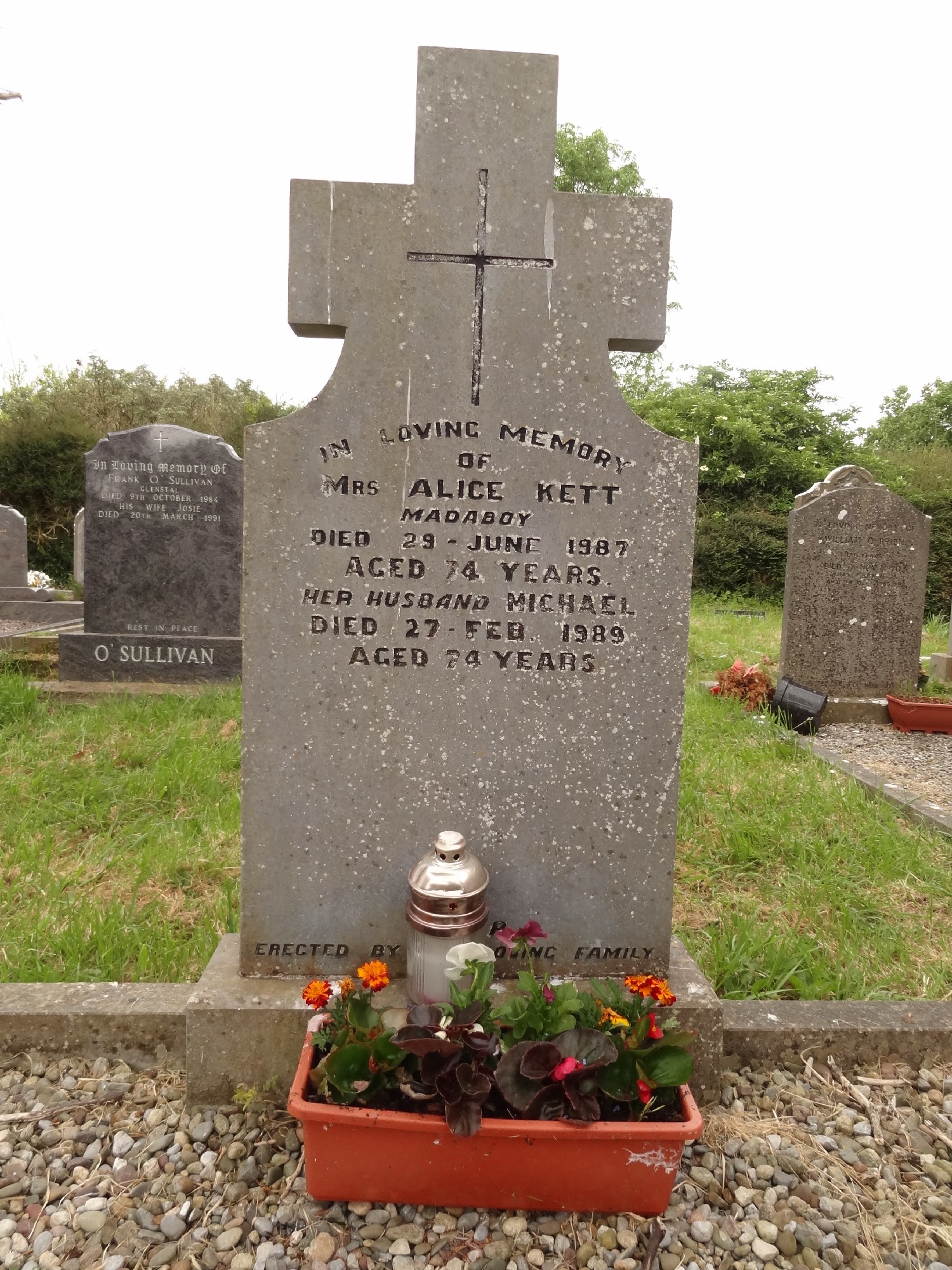 In Loving Memory of Mrs Alice Kett Madaboy Die 23-June-1987 Aged 74 Years Her Husband Michael Died27-Feb-1989 Aged 74 Years Erected by Her Lving Family