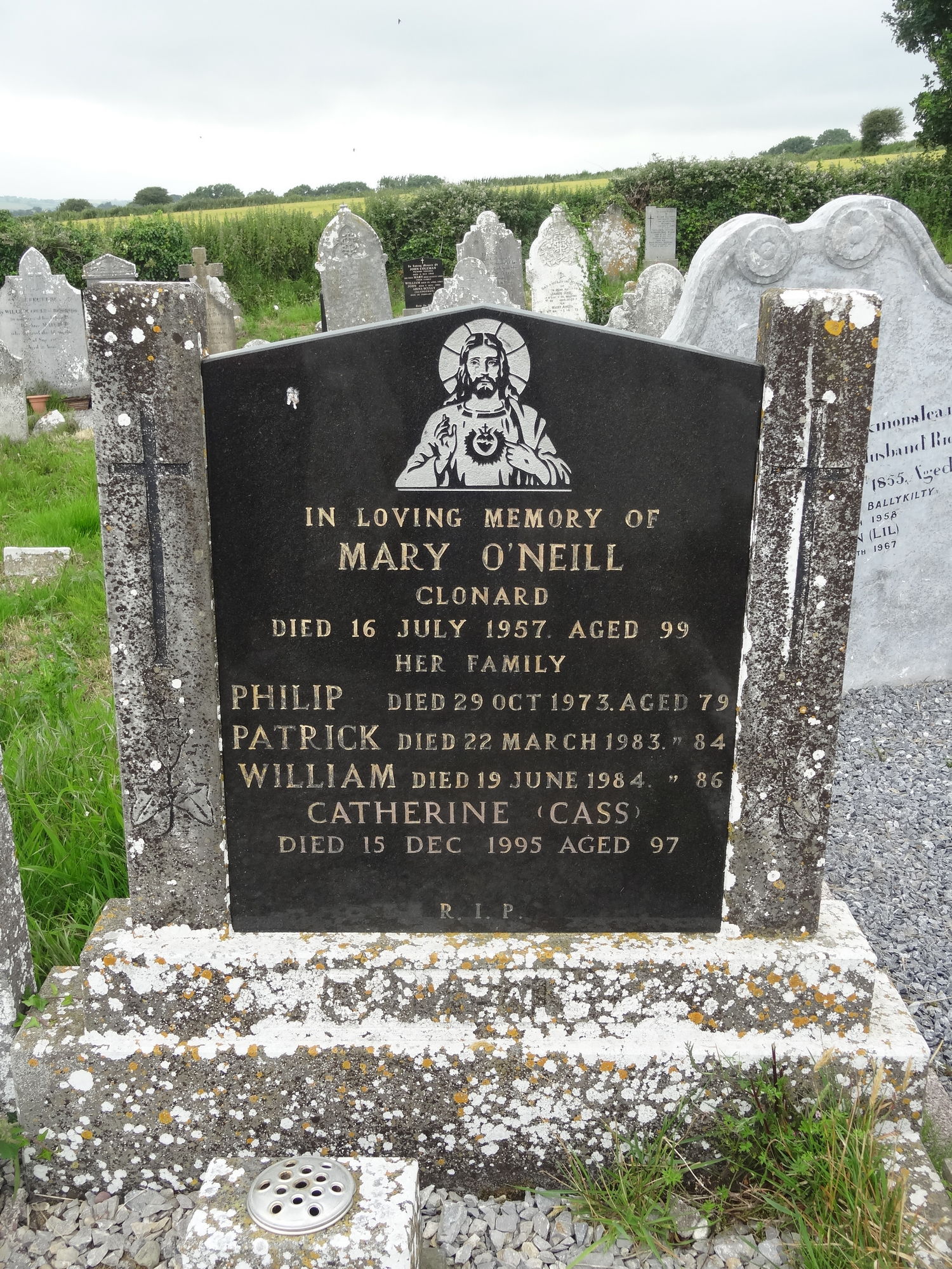 In Loving Memory ofMary O NeillClonardDied 16 July 1957 aged 99her FamilyPhilip died 29 Oct 1973, aged 79Patrick died 22 March 1983, aged 84William died 19 June 1984, aged 86Catherine [Cass] died 15 Dec 1995, aged 97R.I.P.