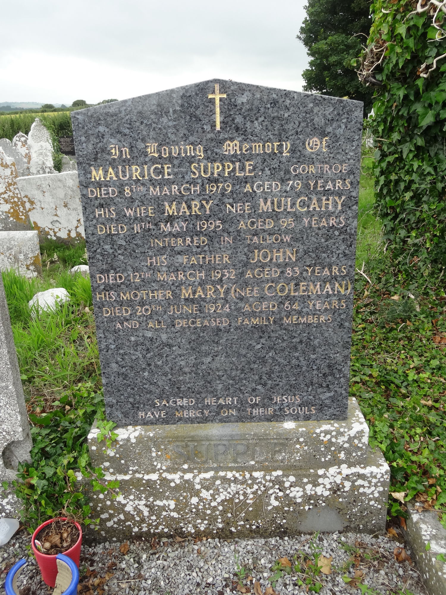SUPPLE [Gortroe] - On May 11 1995 [peacefully] in the presence of her family and in the loving care of the Matron and staff of the District Hospital, Youghal, Minnie [nee Mulcahy] beloved wife of the late Maurice and much loved mother of May [Dennehy], Anna [Foley] and Arthur. Deeply regretted by her loving family, grandchildren, great grandchildren, relatives and friends. Ar dheis Dé go raibh a hanaim dilis. Removal from Murphy's Funerl Home, Cork Hill, Youghal on today [Friday] at 8pm to St. Ita's Church, Gortroe. Requiem mass on tomorrow [Saturday] at 2.30pm. Funeral immediately afterwards to the adjoining cemetery of the Church of the Immaculate Conception, Tallow, Co Waterford.