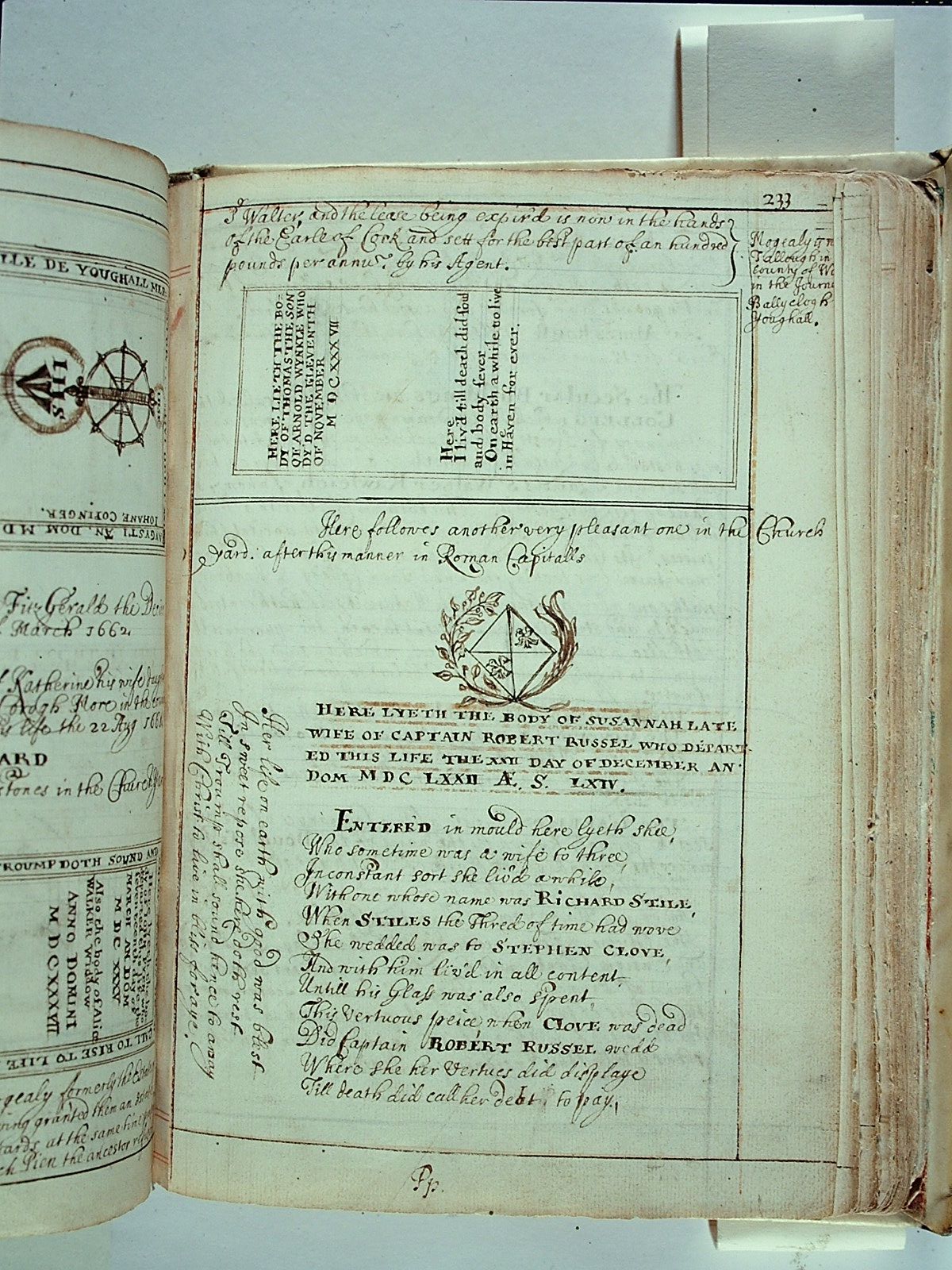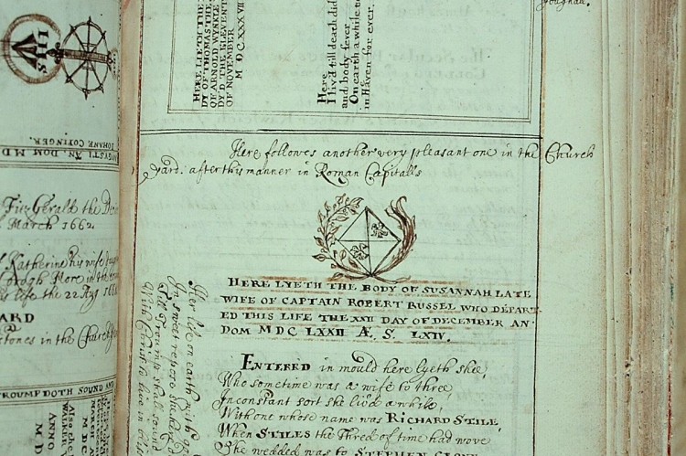 "Here lyeth the body of Susannah late wife of Captain Robert Russel who departed this life the XXII day of December An. Dom. MDC LXX II AE. S. LXIV.
