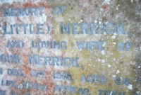 East face:In loving memory of Emily Louisa (Little) Merrick, the dearly loved and loving wife of Samuel John Merrick who entered into rest on Dec 31st 1915 aged 64 years. When Christ who is our life shall appear then shall we also appear with Him in glory. Also of Samuel John Merrick J.P, son of the late Jeremiah Merrick who entered into rest on Jan 24th 1919 aged 73 years.