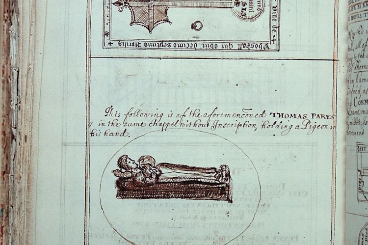 In "Observations on a Journey" by Thomas Dineley in 1681, it has been described thus: "This following (sketch of effigy) is of the aforementioned Thomas Parys, in the same chappel without inscription, holding a pigeon in his hand. Which because it hath nothing of a warrior about it, I rather took it for the figure of a monk in his weeds and the bird to represent the Holy Ghost, than to believe the groundless tradition of the townsmen."