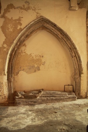 In Samuel Hayman's "Ecclesiastical Antiquities of Youghal" (1854), this effigy is described thus: "Beneath the arch is a recumbent effigy of some distinguished, but now unknown, personage. It is that of a man, seemingly advanced in life, clad in a loose tunic of long drapery wholly unornamented. His head reposes on a pillow. The countenance is inexpressibly benign, yet dignified. The hair is short, and the chin beardless. He holds a falcon to denote his rank ; and his feet rest upon a talbot. This effigy, which had many years since been taken out of the arch, and which lay, at different times, in different parts of the church, was, Jan. 19, 1853, restored to its original position, never, we hope, to be again disturbed."
