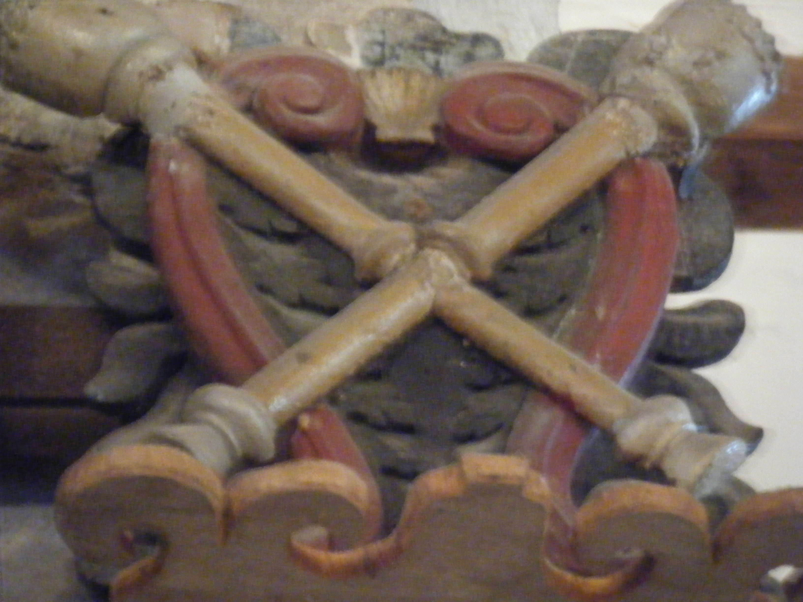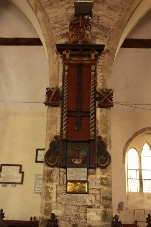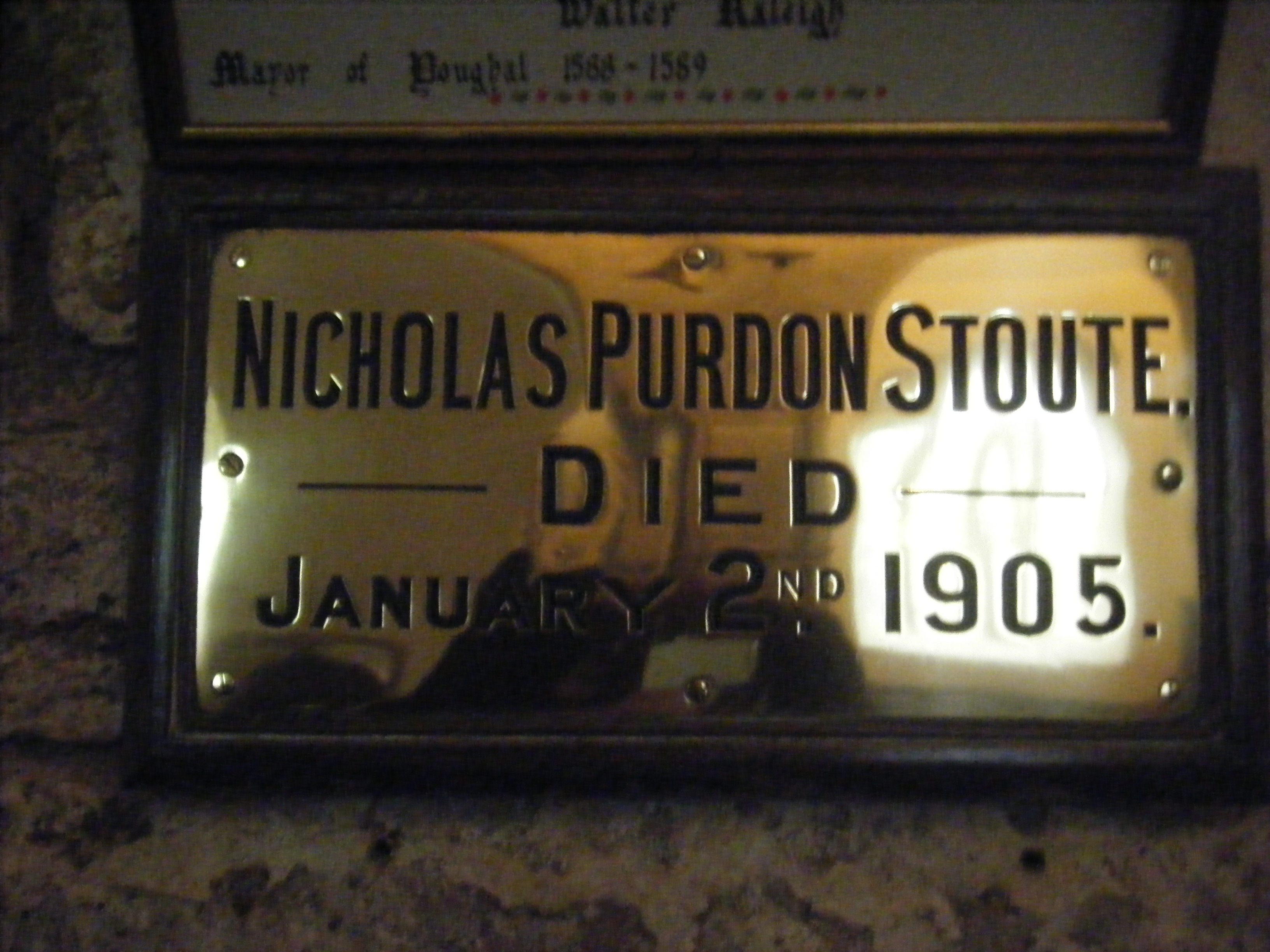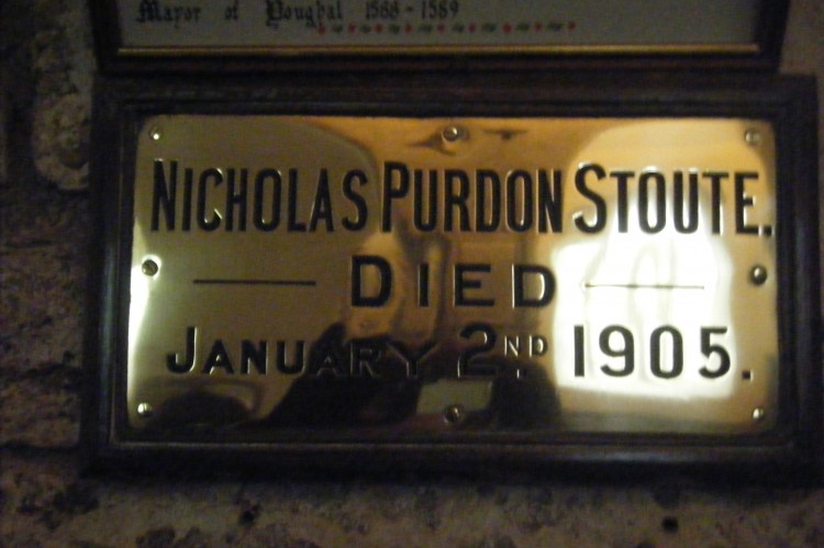 Above the brass plaque to Nicholas Purdon Stoute is a ceremonial sword rest.This is described in Hayman's "Ecclesiastical Antiquities of Youghal" 1854 thus : "In the wall beside it is an antique "rest" for the sword, which the mayor, by virtue of the chater of James 1, was privileged to have borne before him.It is of timber, curiously carved, but somewhat gaudily painted. At the base are the arms of the burough, an ancient galley. In the centre is the case for the sword; on the dexter side of which are two corporate maces in saltier, and on the sinister one in bend.At the summit are the royal arms, and immediately beneath them, in gilt letters " E.C. Anno Domini 1684" i.e Edward Crockford who was Mayor of Youghal in that year.