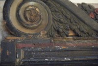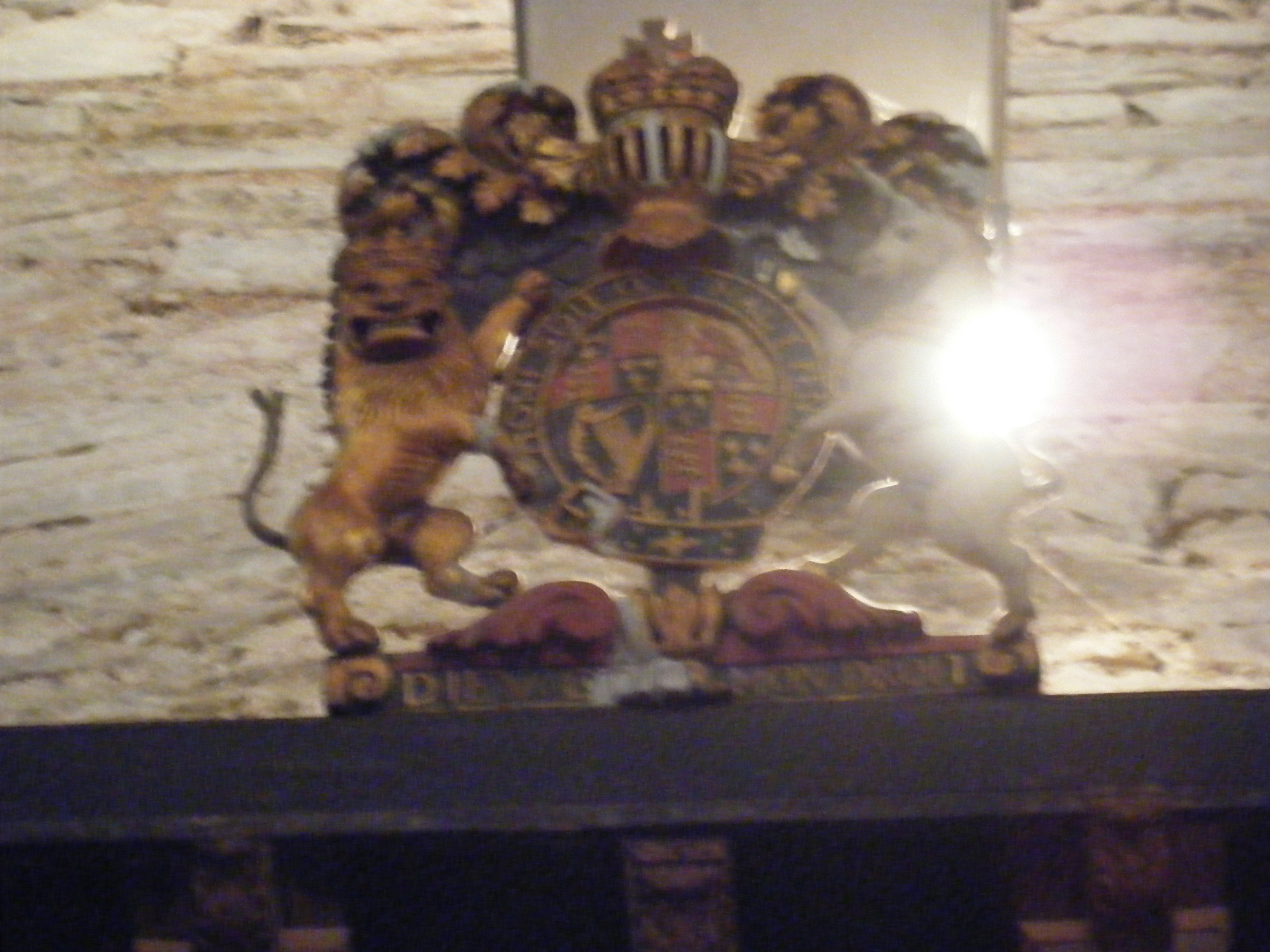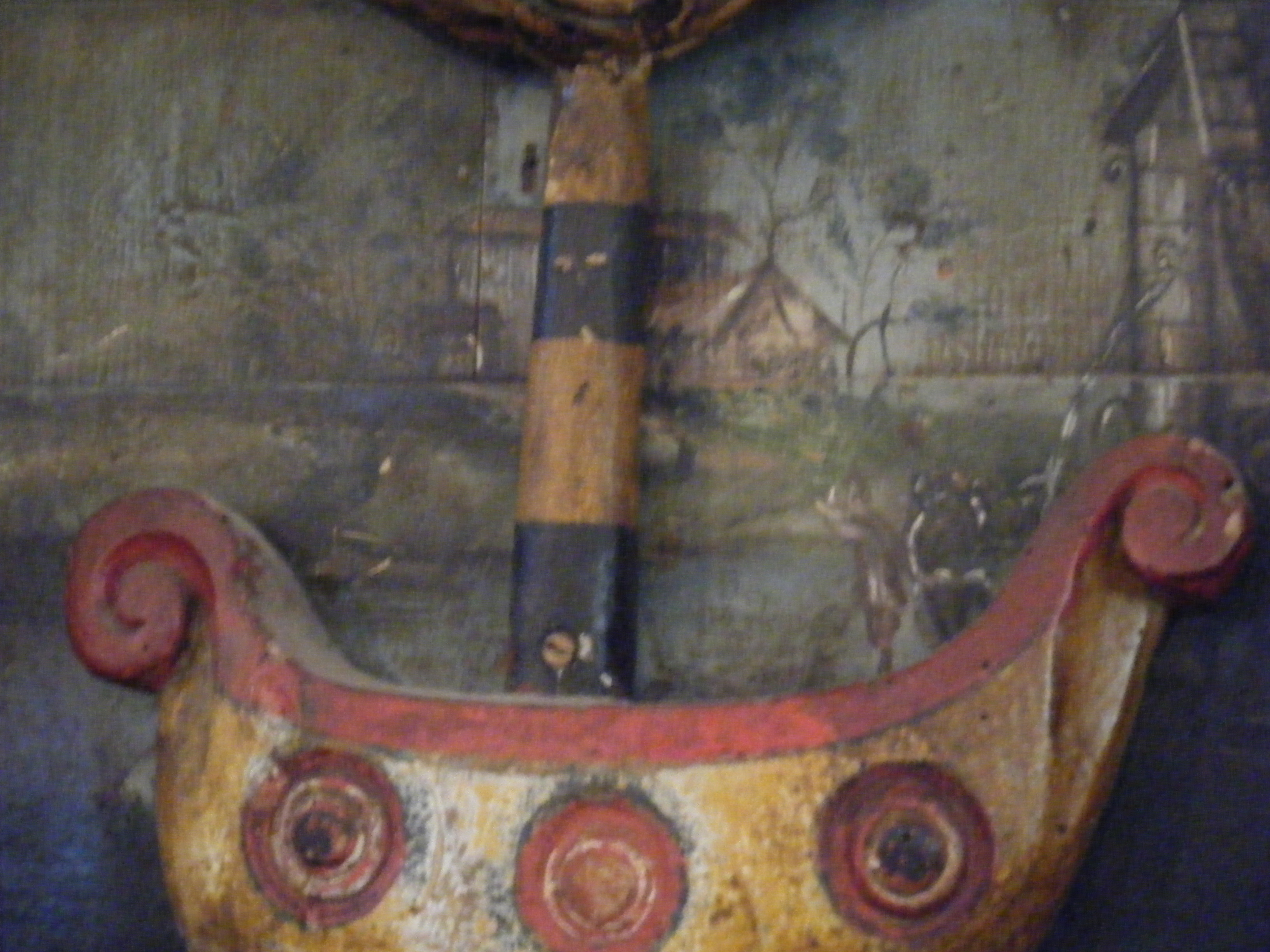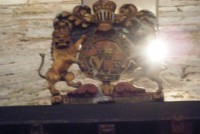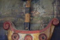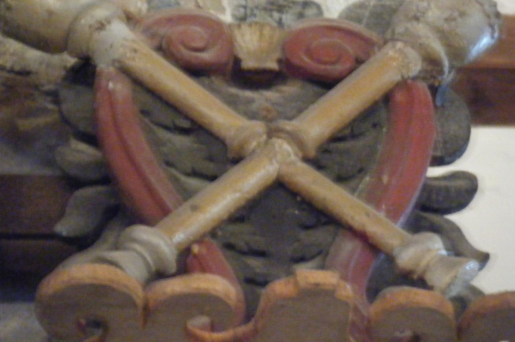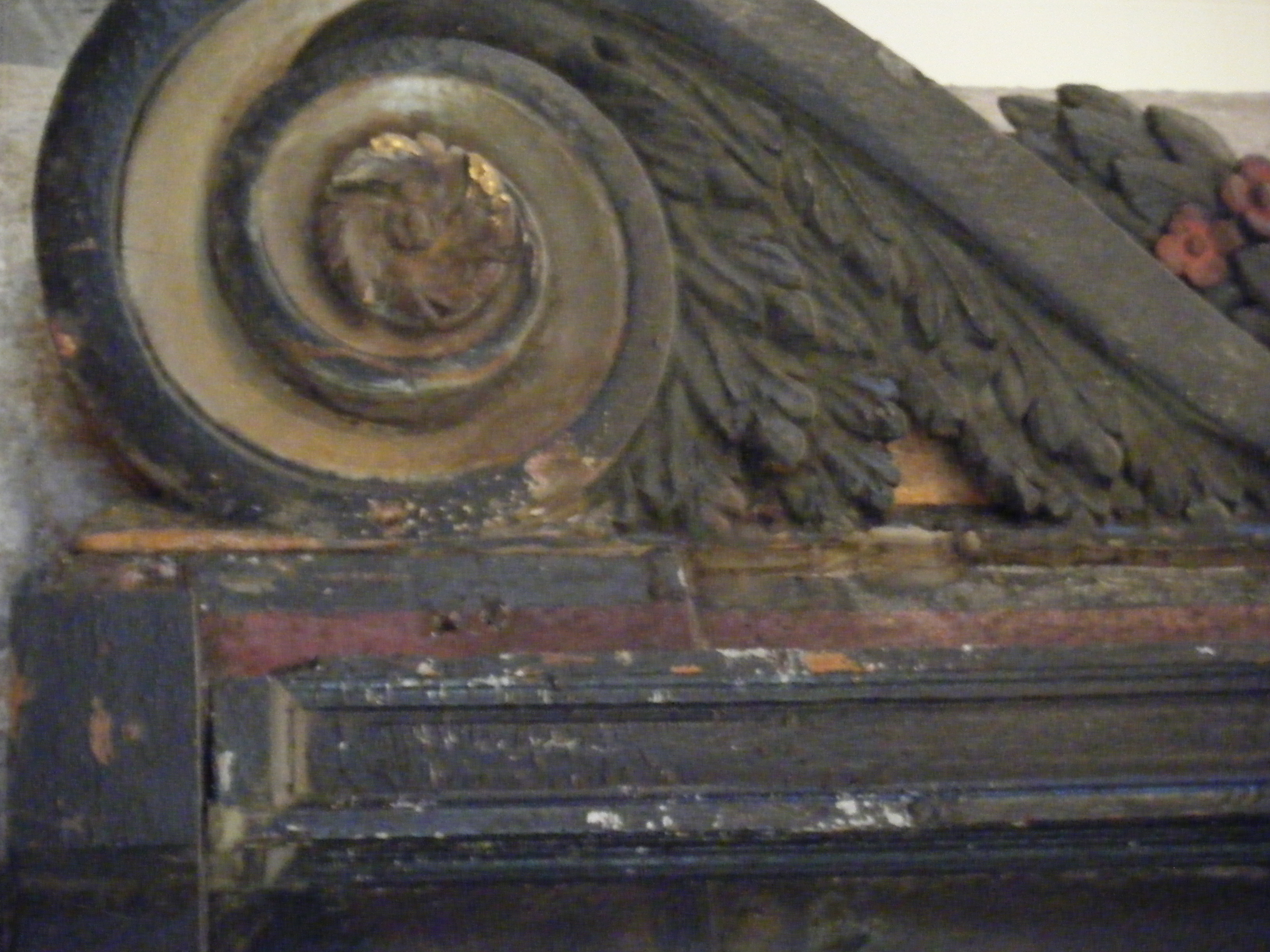 Above the brass plaque to Nicholas Purdon Stoute is a ceremonial sword rest.This is described in Hayman's "Ecclesiastical Antiquities of Youghal" 1854 thus : "In the wall beside it is an antique "rest" for the sword, which the mayor, by virtue of the chater of James 1, was privileged to have borne before him.It is of timber, curiously carved, but somewhat gaudily painted. At the base are the arms of the burough, an ancient galley. In the centre is the case for the sword; on the dexter side of which are two corporate maces in saltier, and on the sinister one in bend.At the summit are the royal arms, and immediately beneath them, in gilt letters " E.C. Anno Domini 1684" i.e Edward Crockford who was Mayor of Youghal in that year.