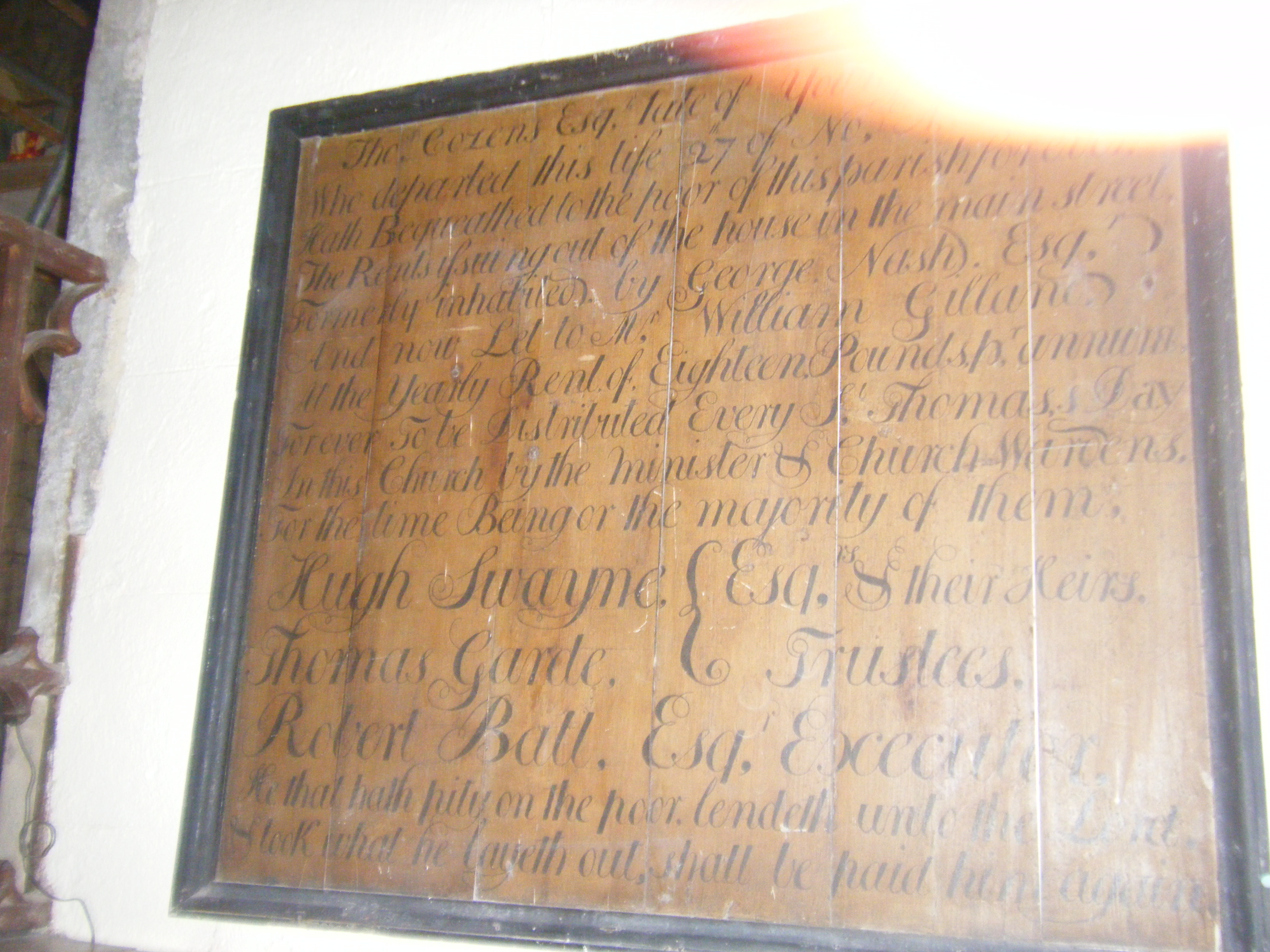 Hugh Swayne, Thomas Garde, Esqrs & their heirs, Trustees, Robert Ball, executor. He that hath pity on the poor lendeth unto the Lord, & look what he layeth out shall be paid him again.”