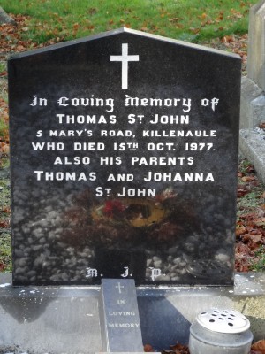 In loving memory of Thomas St. John 5 Mary's Road, Killenaule who died 15th Oct 1977 also his parents Thomas and Johanna St. John