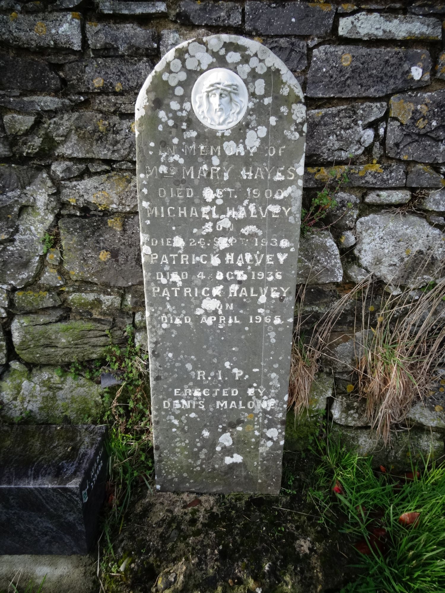 IN MEMORY OFMRS MARY HAYESDIED OCT 1909MICHAEL HALVEYSONDIED 26 SEPT 1936PATRICK HALVEYDIED 4 OCT 1936PATRICK HALVEYSONDIED APRIL 1965R.I.P.ERECTED BYDENIS MALONE