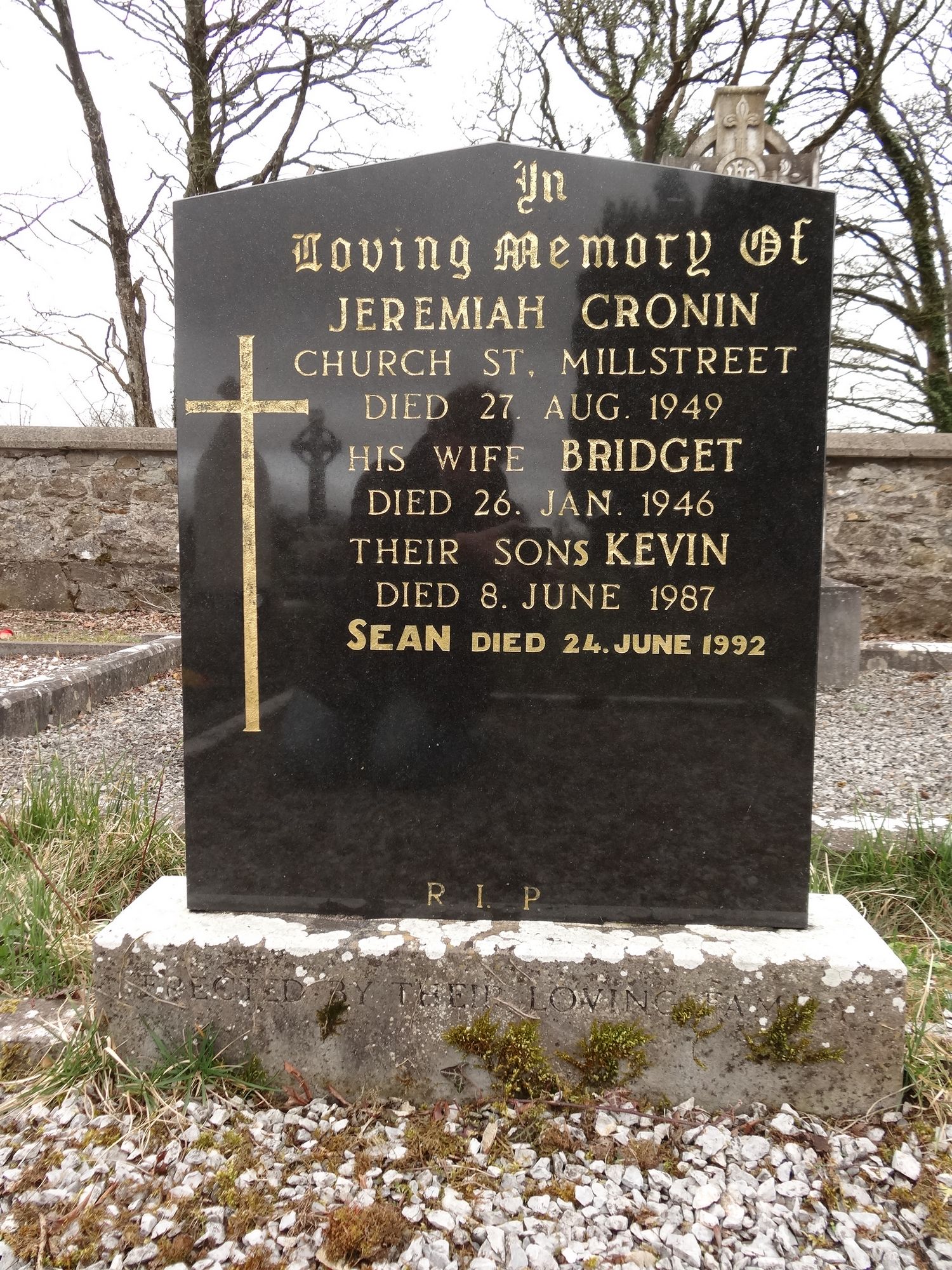InLoving Memory OfJEREMIAH CRONINChurch St. MillstreetDied 27 Aug 1949His wife BRIDGETDied 26 Jan 1946Their sons KEVINDied 8 June 1987SEAN died 24 June 1992