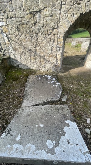 Large flat stone, inside church in railed off section. Stone broken in several fragments.