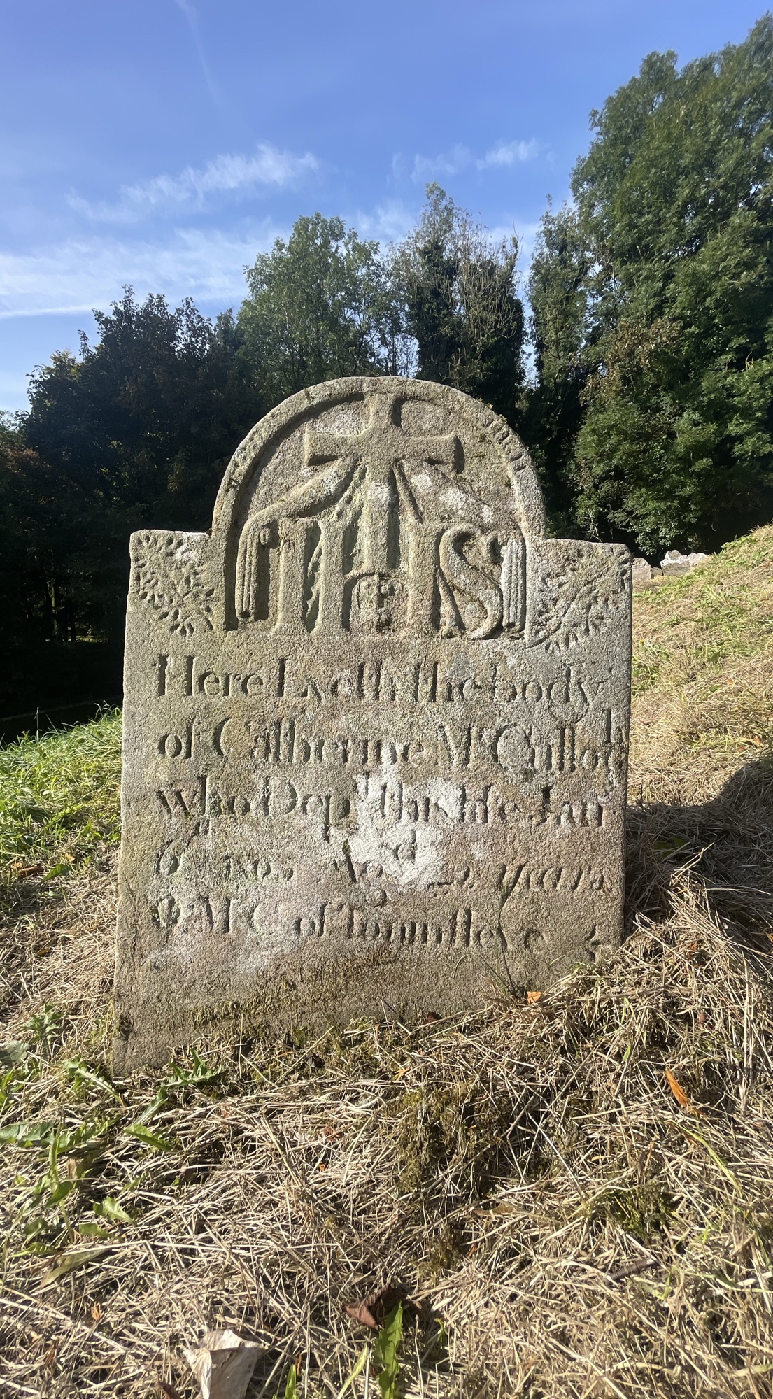 IHS Here lyeth the body of Catherine McCullogh who departed this life Jan 6th 1805 agd 22 years of Tonintleve. OMC.