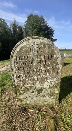 IHS Here lieth the body of Mary McMahon dautr of Con McMahon of Drumore who departed this life April the 2d 1763 aged 23 years.