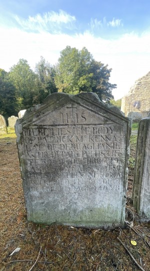 IHS Here lies the body of Patrick McKenna late of Derraghanie who departed this life the 30th of Octobr 1749 aged 70 yrs & also his son Felix McKenna who died the 19th of October 1759 aged 40 yrs.