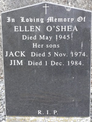 + In loving memory of Ellen O’Shea Died May 1945 Her sons Jack died 5 Nov.1974. Jim died 1 Dec. 1984. R I P